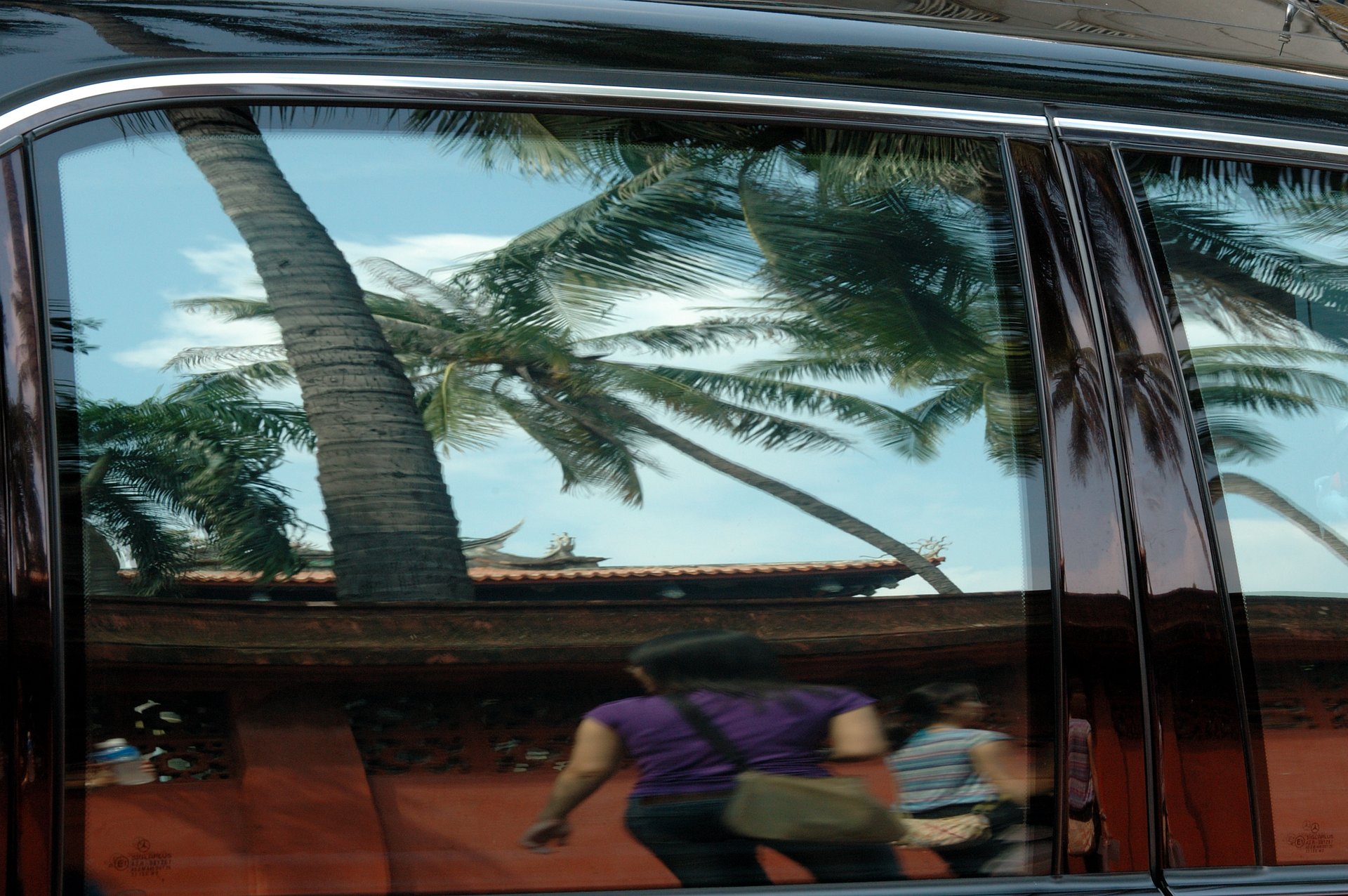 城市印象 王啟瑞地點:赤崁樓外牆從赤崁街上的汽車玻璃窗反映出,遊客與赤崁樓建築。我本來選的是CRV拍到一半它就開走了,這張是賓士的車窗。