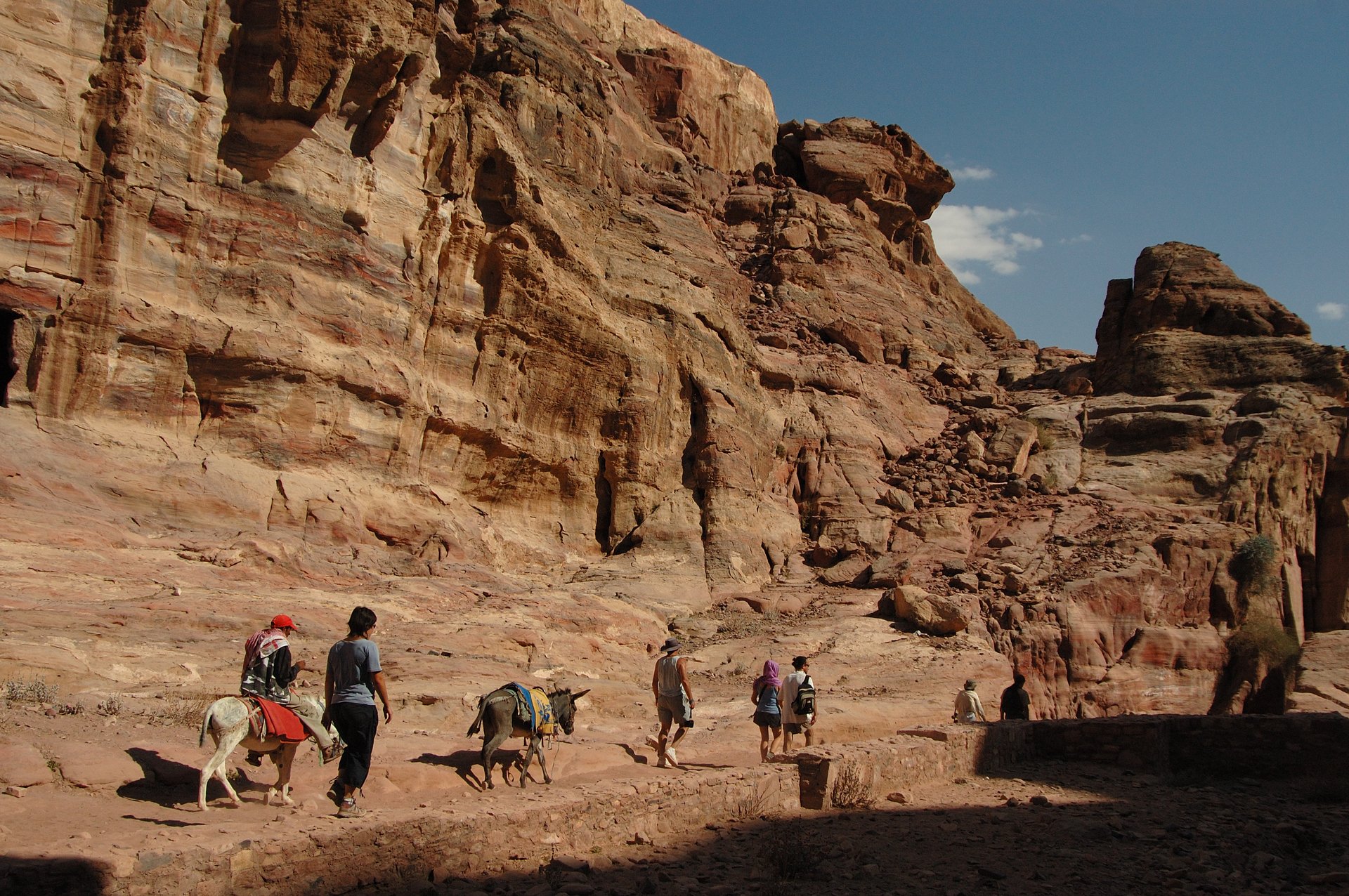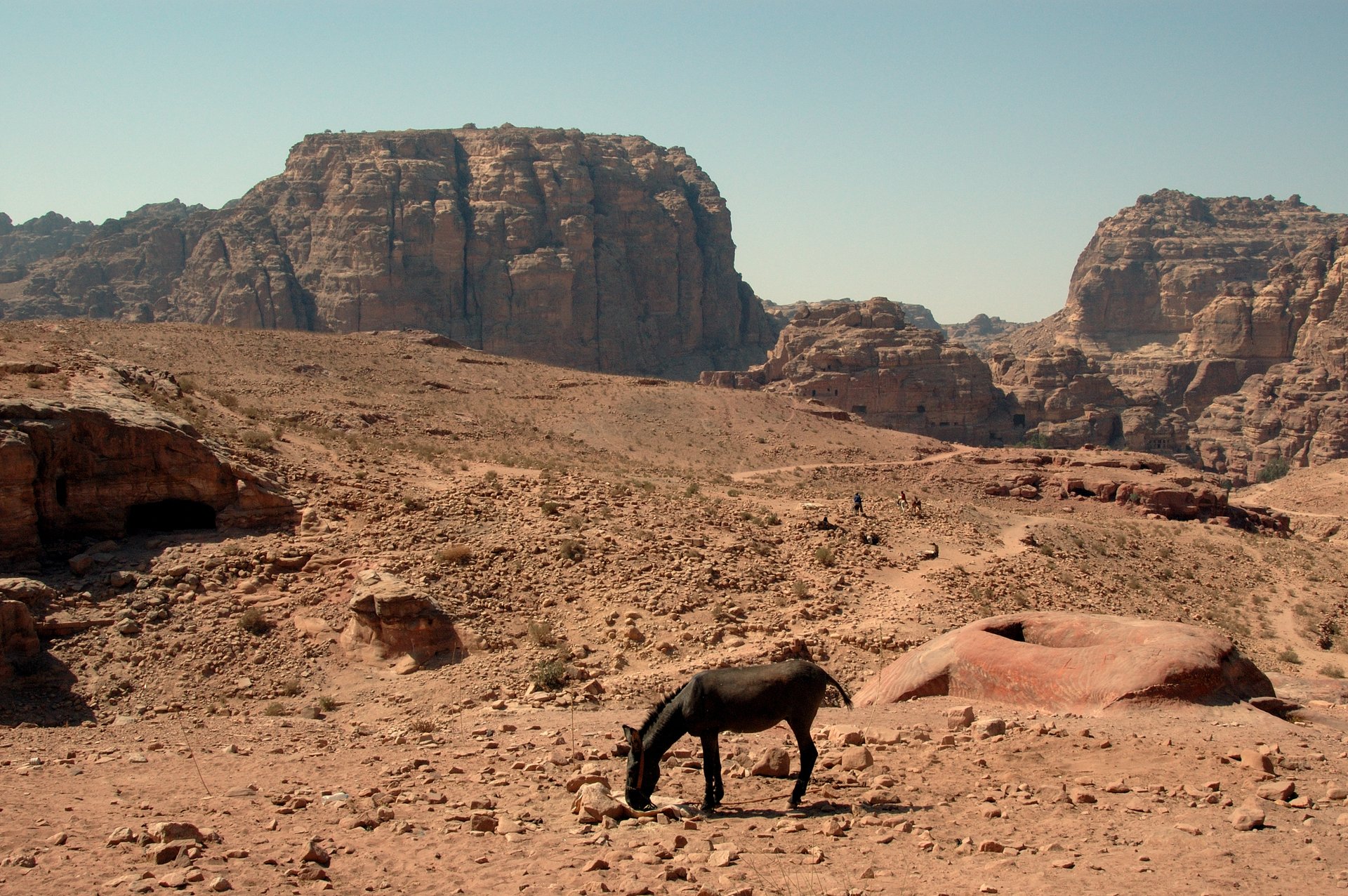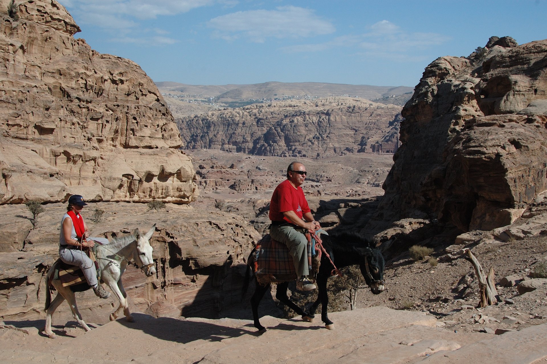 petra 佩特拉古城區內有不同的動物交通工具可以搭乘,有驢子、馬、與駱駝。最可憐的應該是驢子,一路上常看到瘦小的驢子,載著身材魁梧的老外爬上陡峭山坡,有點不忍。