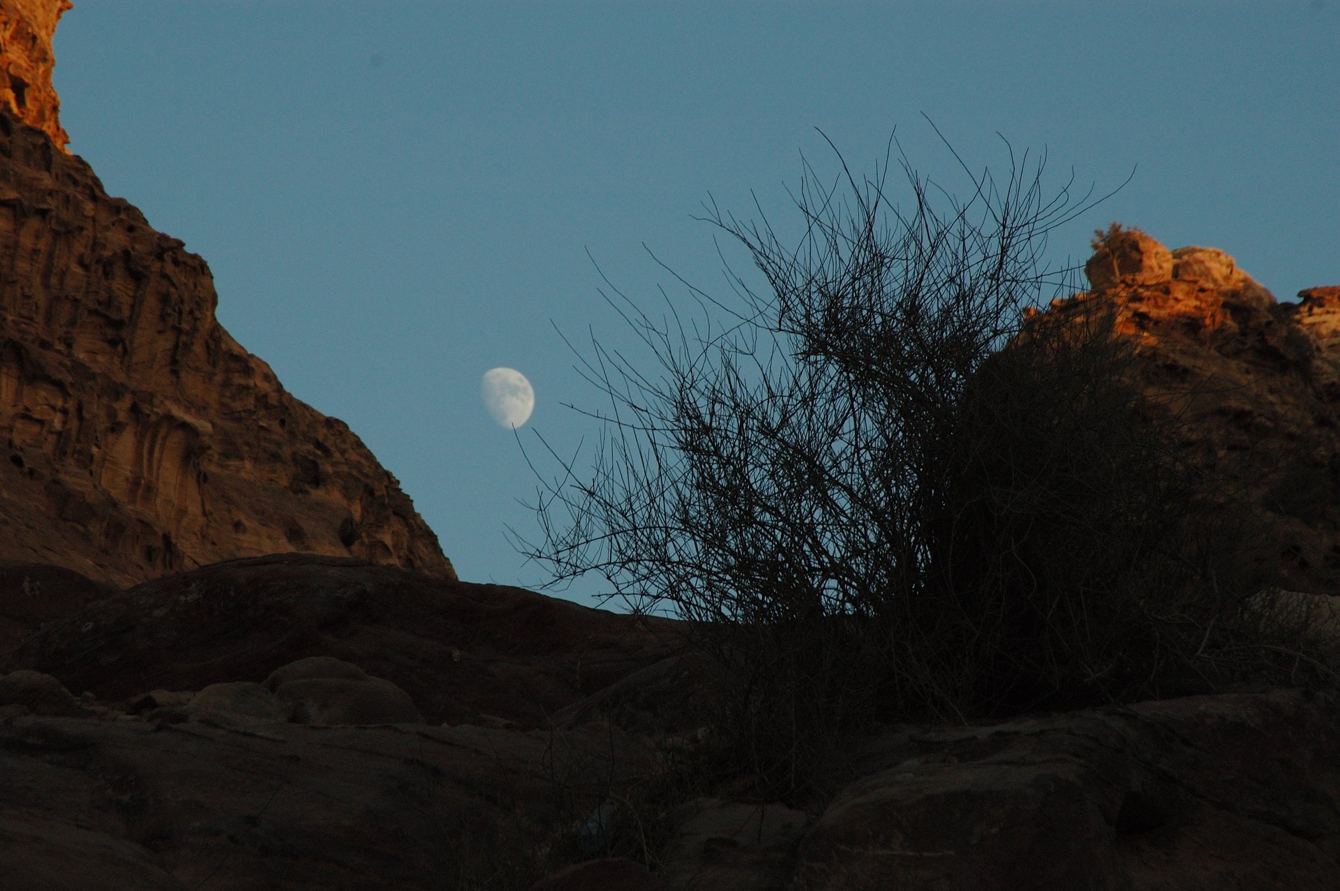 petra 佩特拉當落日餘暉照在山壁上,絢出美麗的金黃色,而悄悄的月亮已爬上枝頭。