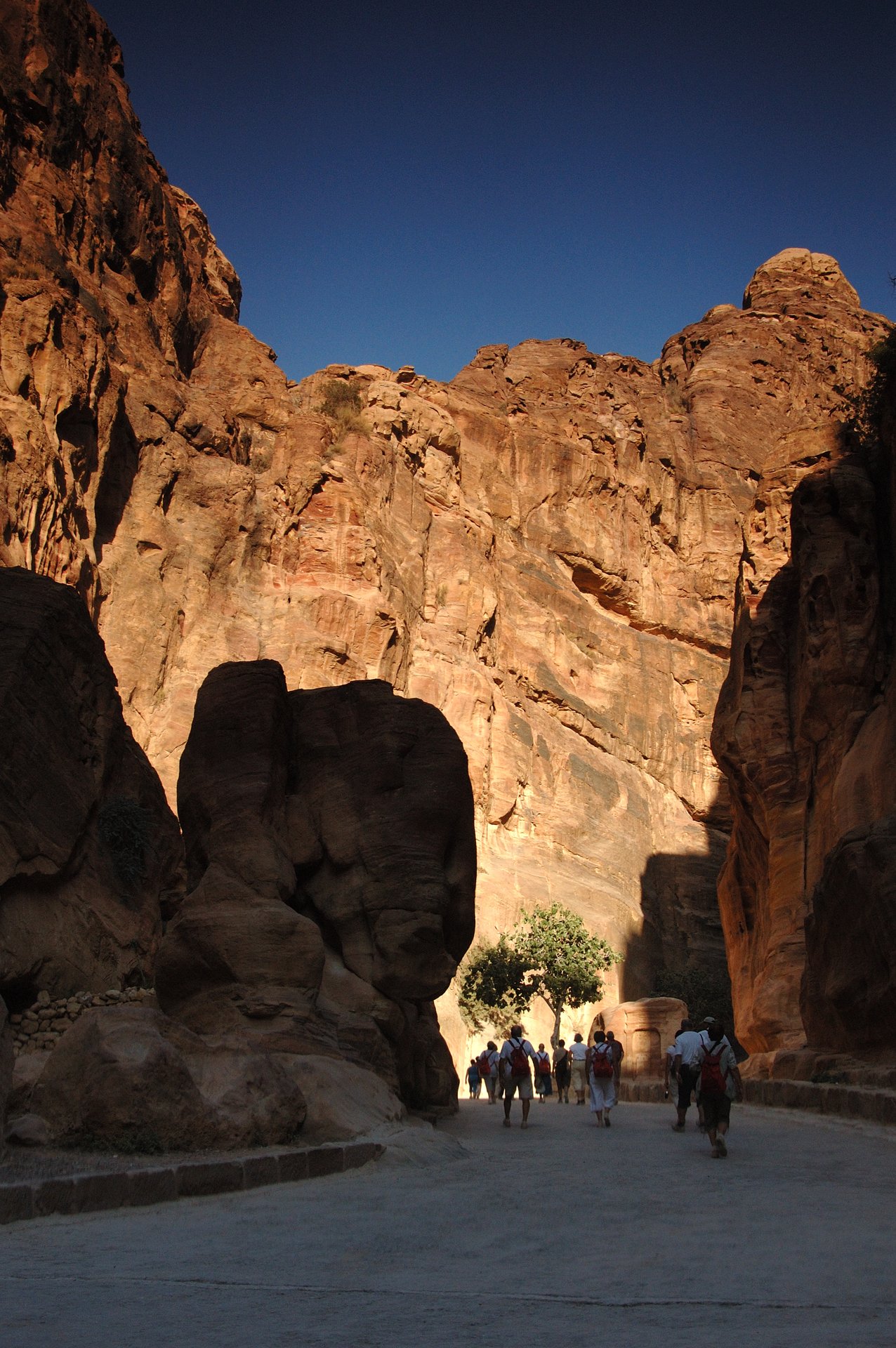 petra 佩特拉1985年被聯合國教科文列為世界文化遺產的「粉紅玫瑰城」,蛇道(Siq)是它的入口點,兩側高約80-150公尺的峭壁,夾著細長彎曲的峽谷步道宛如蛇身。