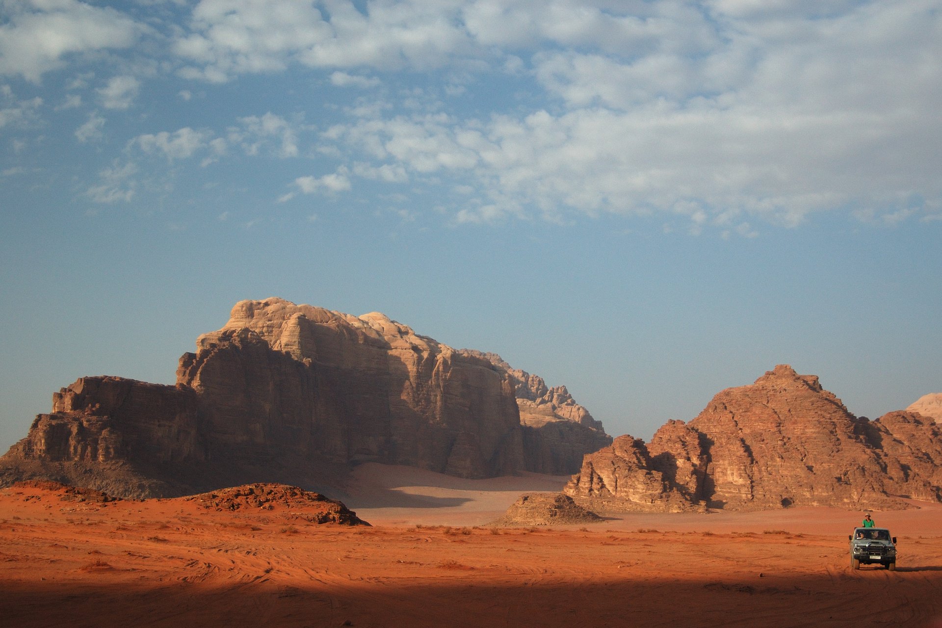 Wadi Rum 瓦第倫這裡不是撒哈拉沙漠,沒有綿延不絕的沙丘,這裡是約旦的沙漠,雄偉峻峭的山頭矗立在眼前。