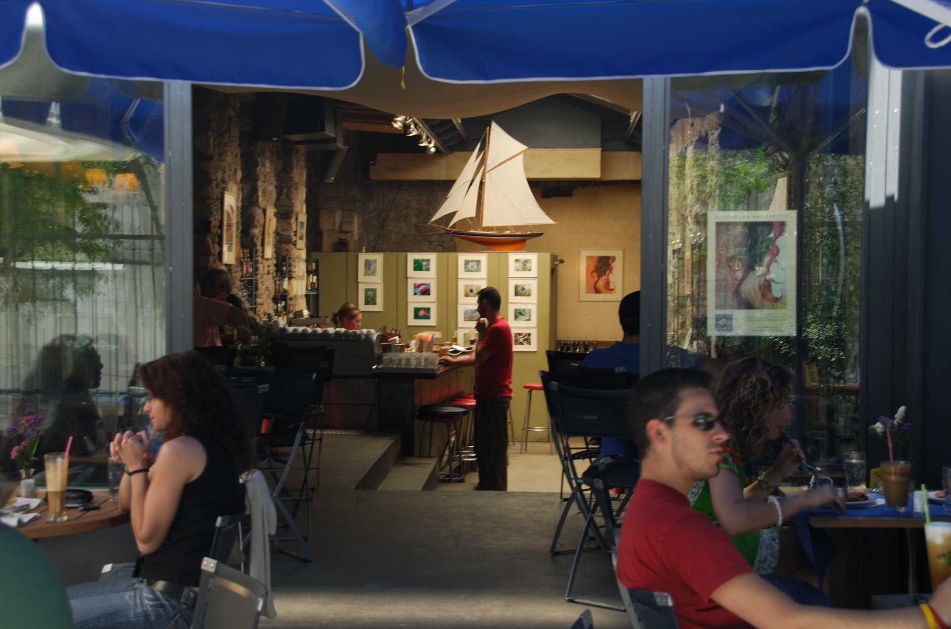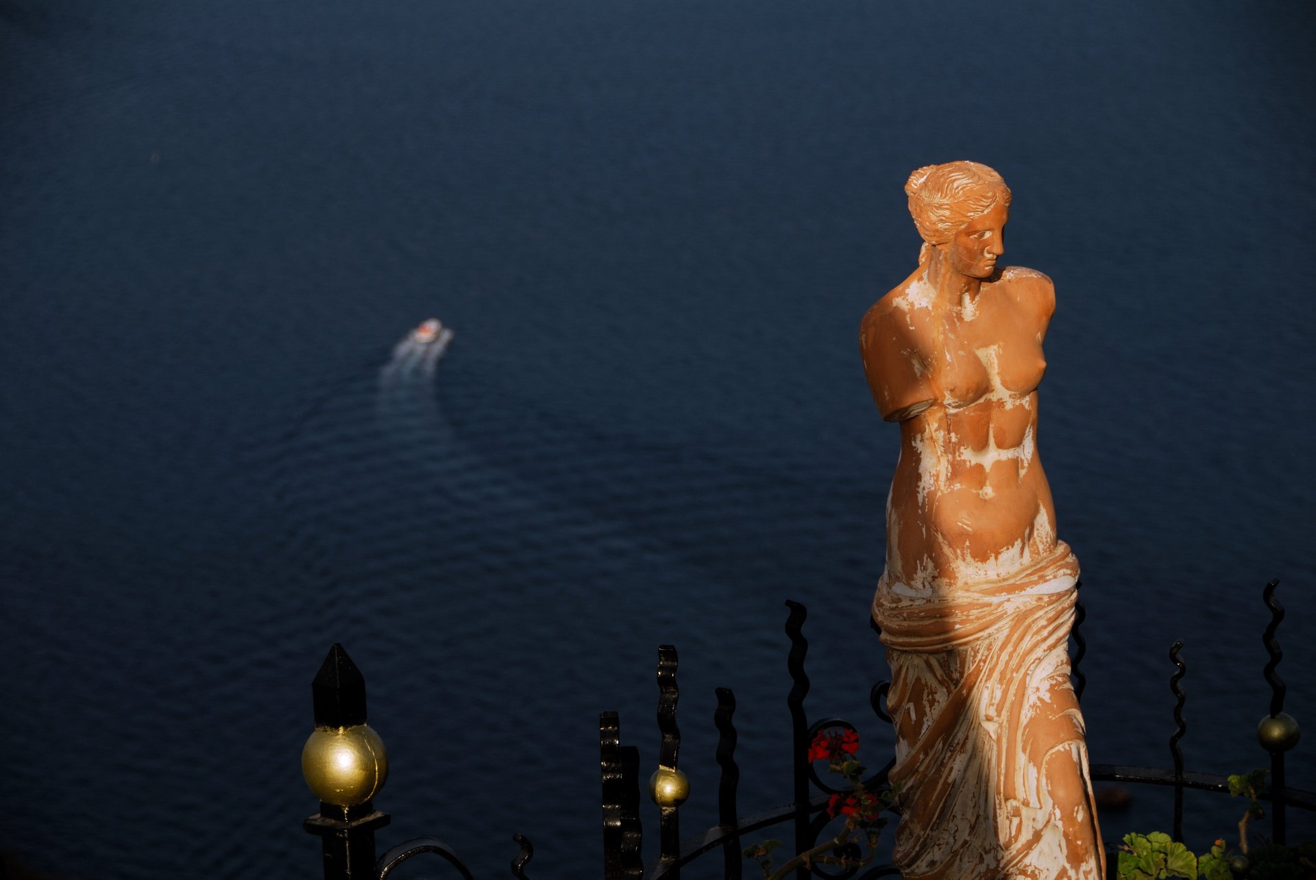 Fira 費拉有名的斷臂維納斯雕像,就在鐵人裝置藝術的對面。在一家小小的露天bar裡面,老闆很客氣打聲招呼就可以進去拍照。
