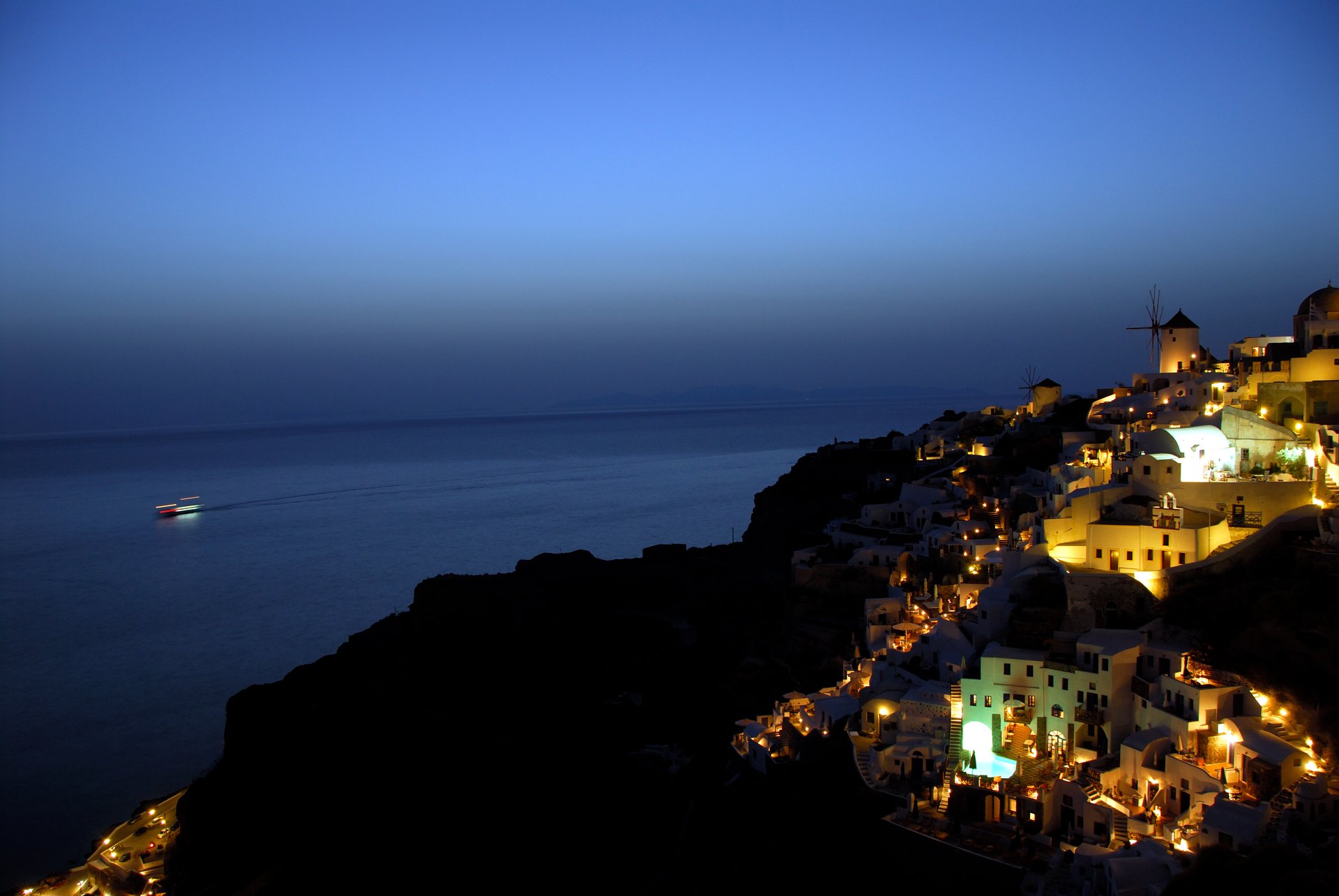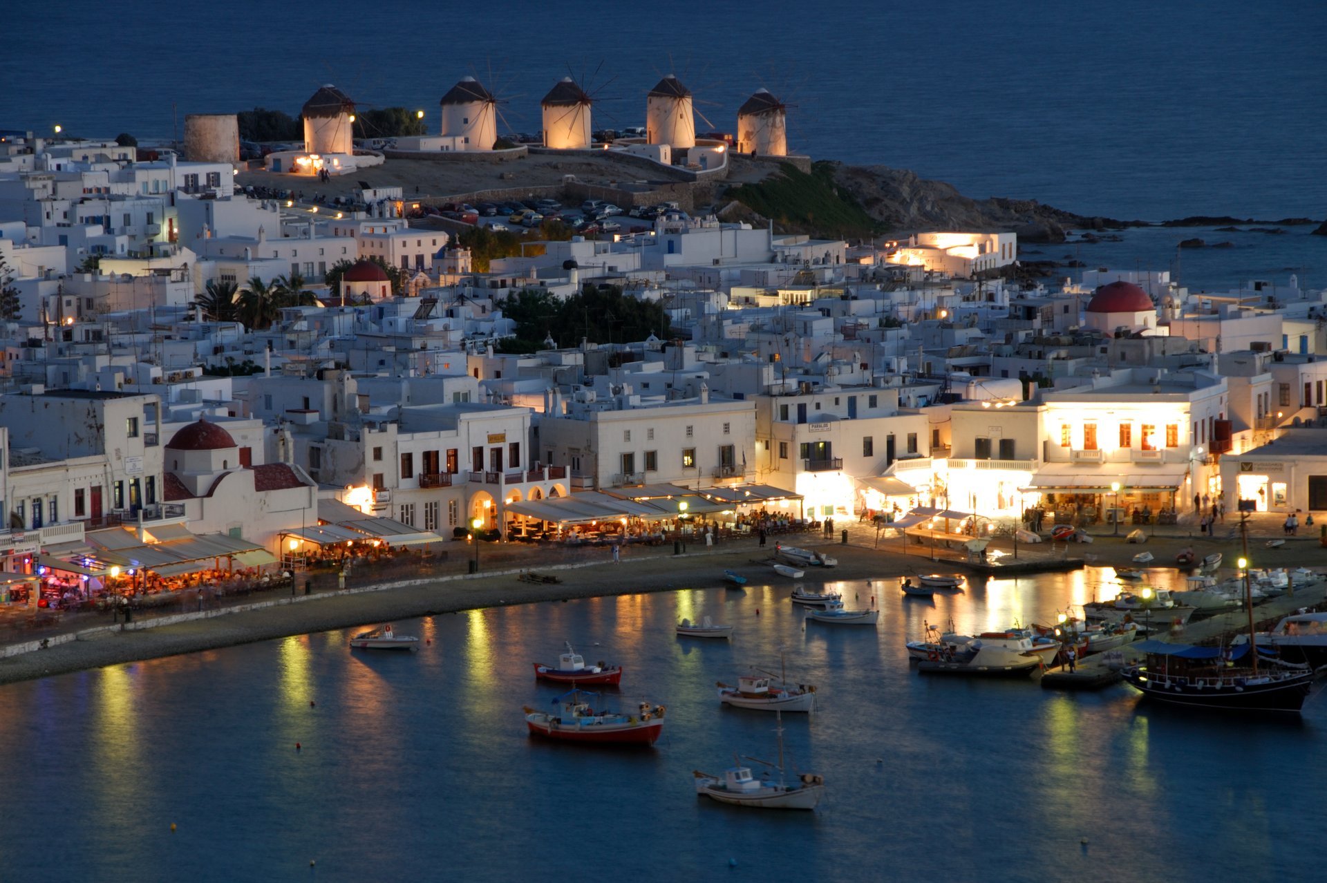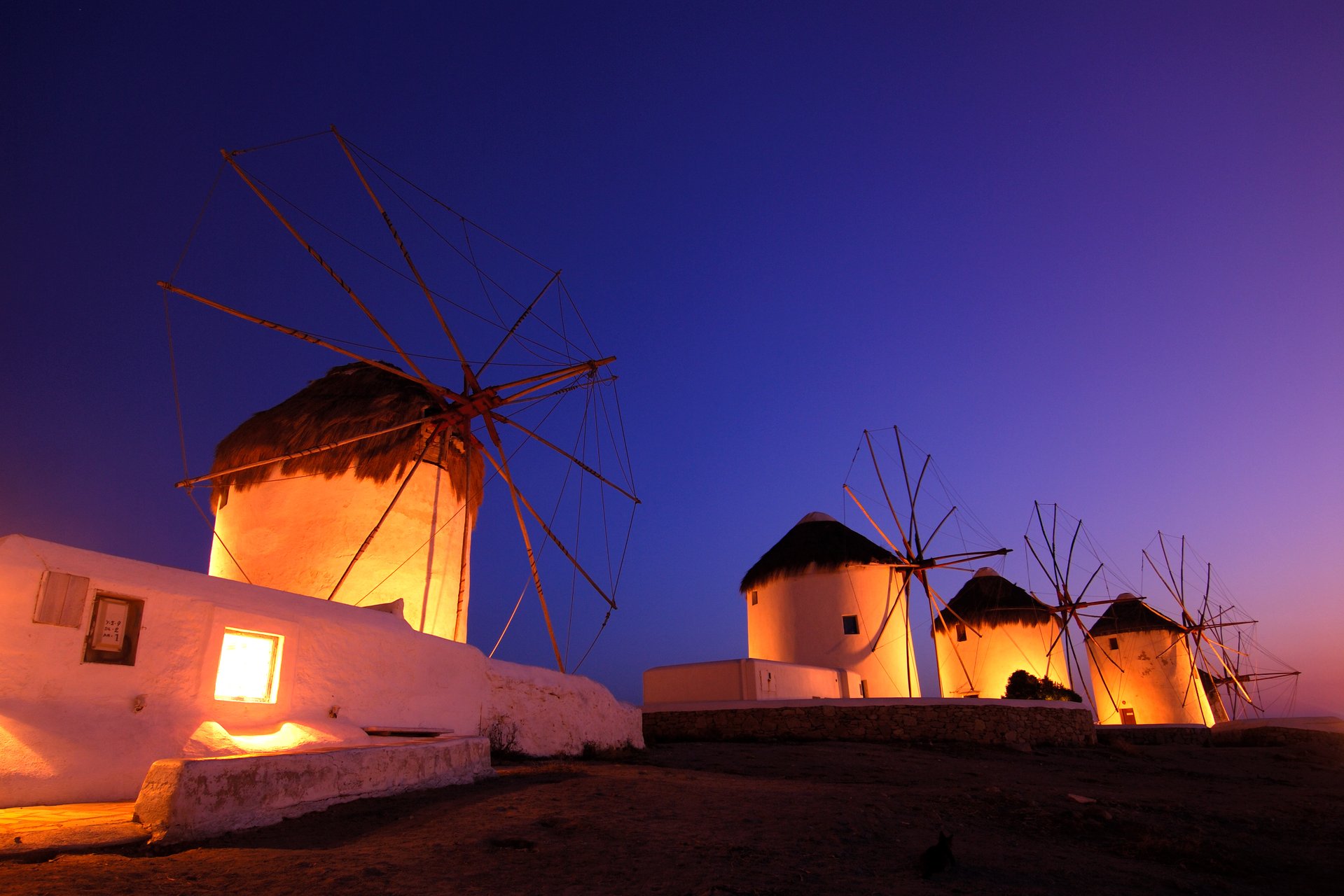 Mykonos米克諾斯從港口旁的山丘上遠眺整個港灣夜景,Mykonos的地標五座風車歷歷在目。