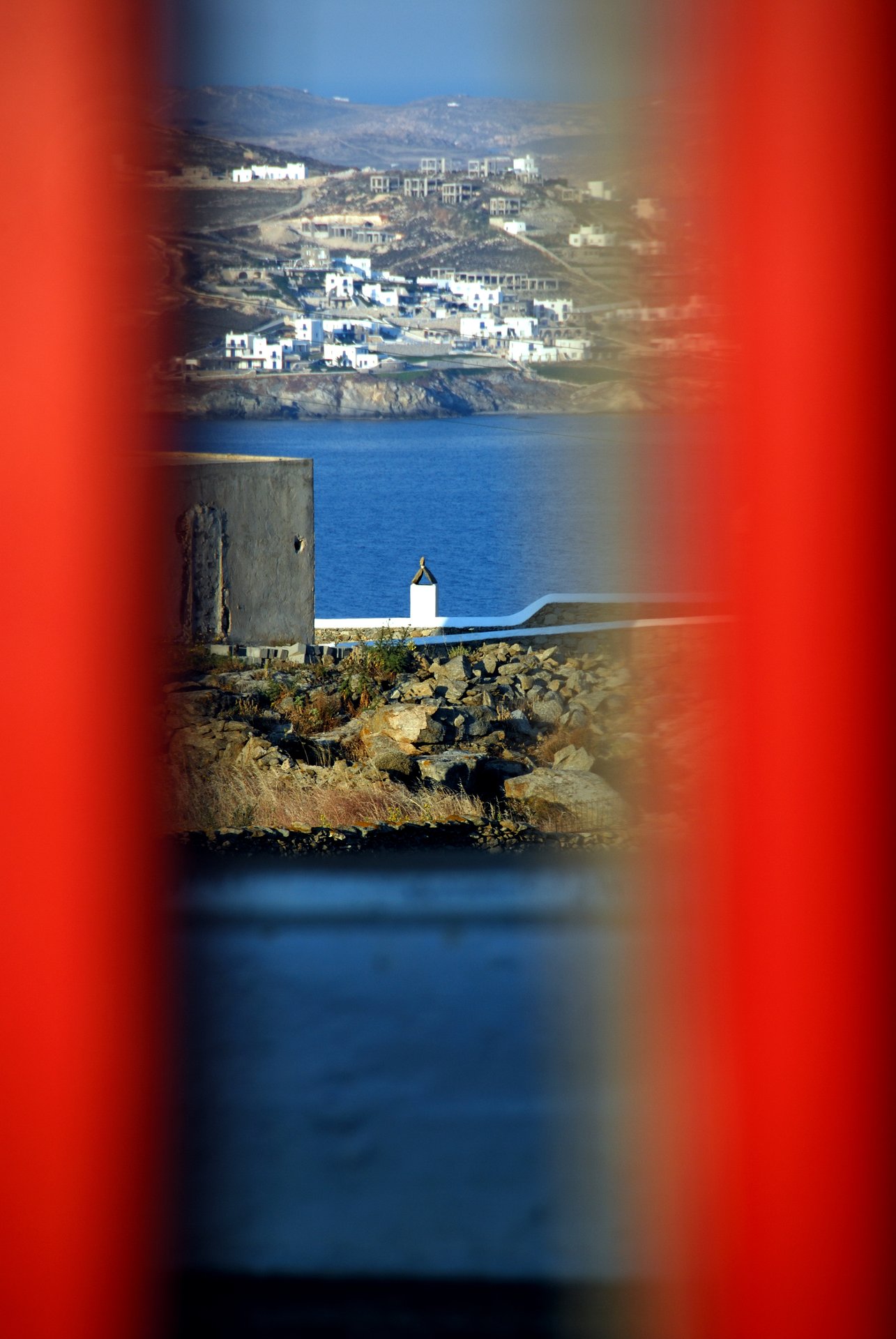 Mykonos米克諾斯從教堂紅色的窗台望去,藍色愛琴海真的很美。