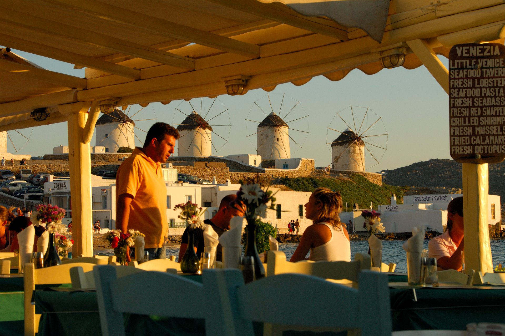 Mykonos米克諾斯先生:你們是土匪啊,這menu上的價格太嚇人啊!服務生:這裡是看夕陽最好的位置,背後又是有名的風車。太太:別抱怨啦,人家一輩子才來一次愛琴海。
