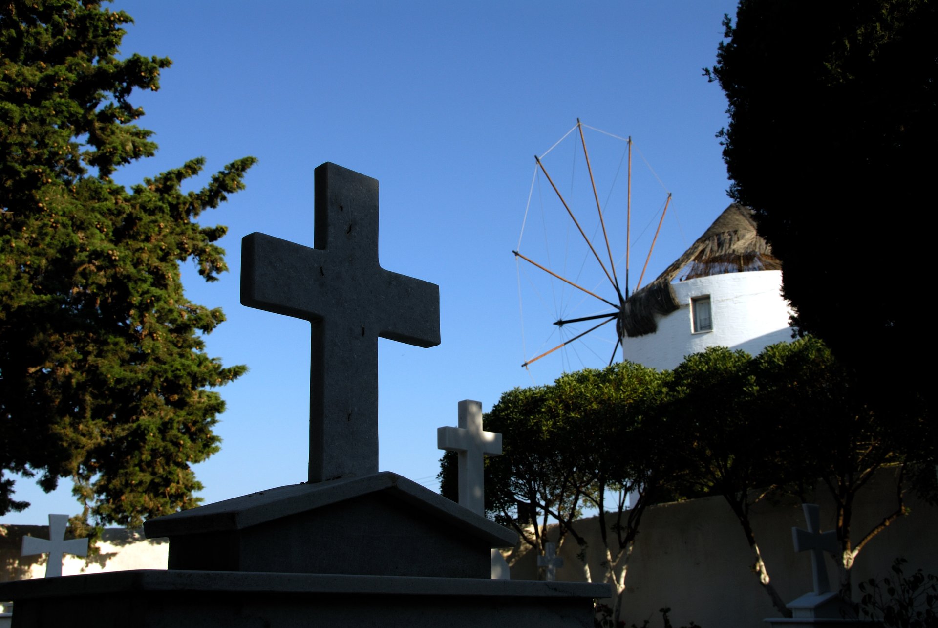 Naoussa那烏沙教堂後面的墓園,很優靜而且鳥語花香,還有風車為伴。