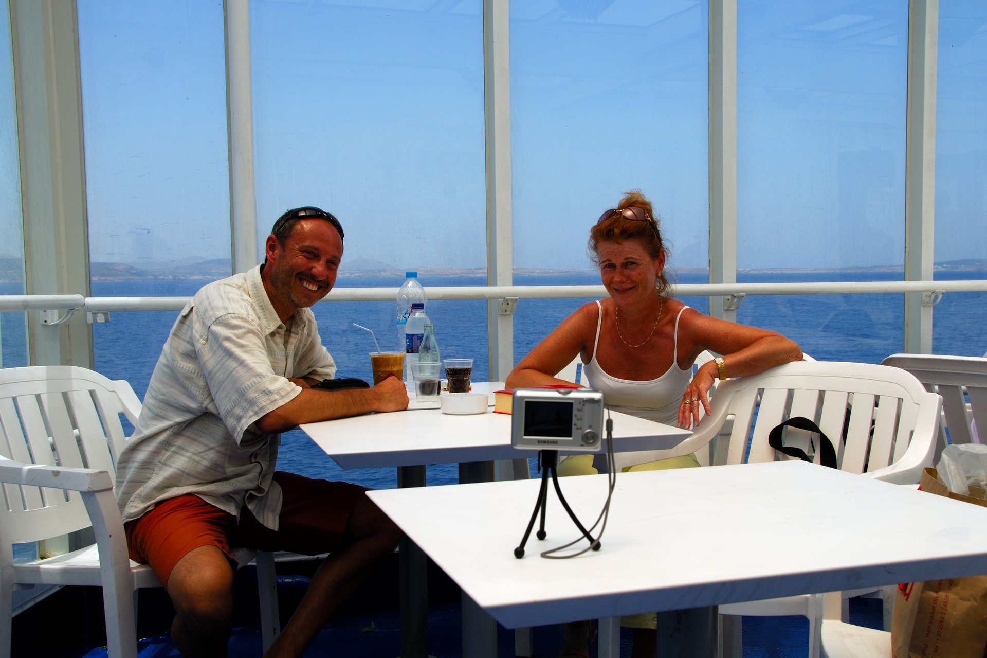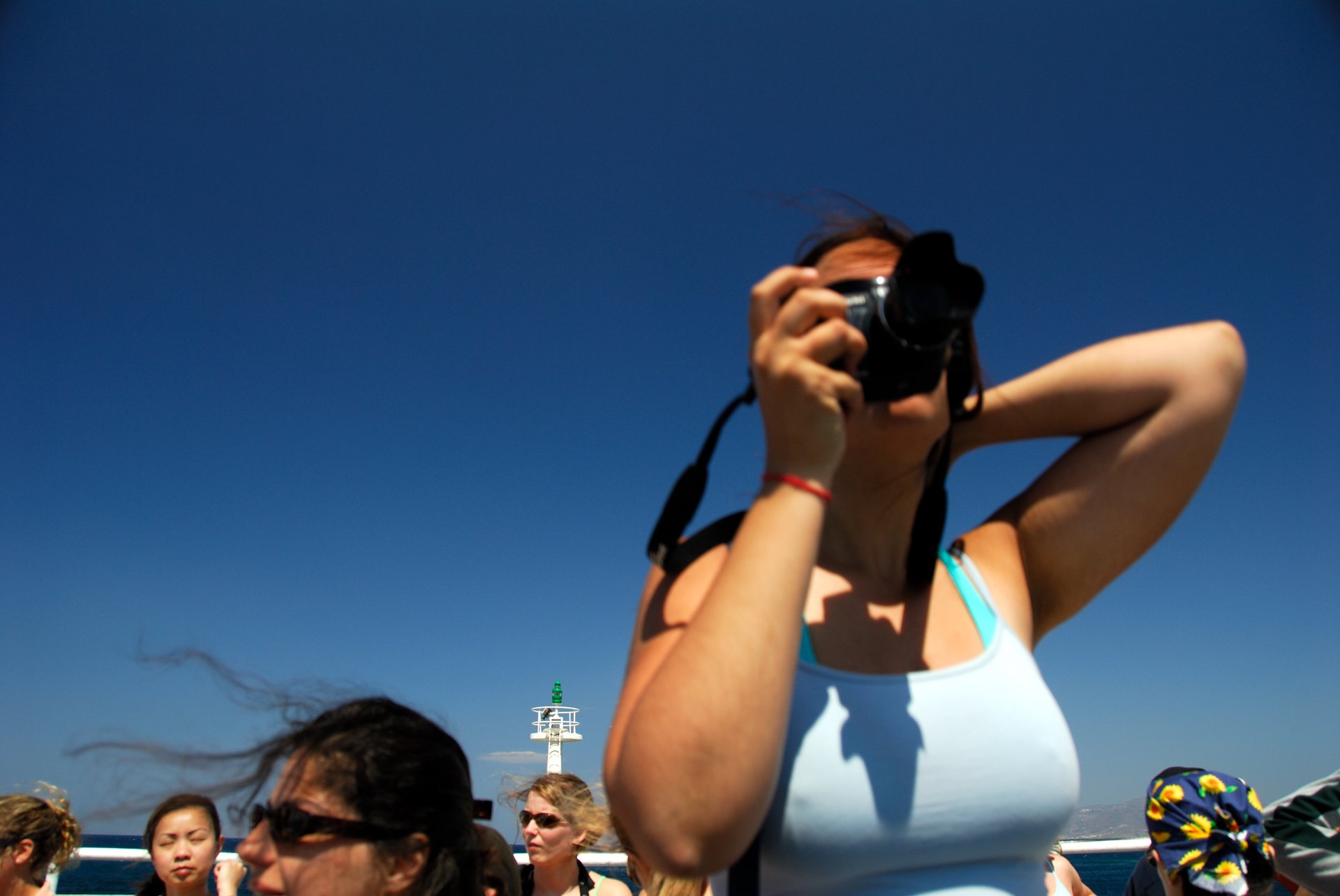Delos提洛島船上近距離面對面的旅客站起來拍照,我順勢寫下我的愛琴海印象。