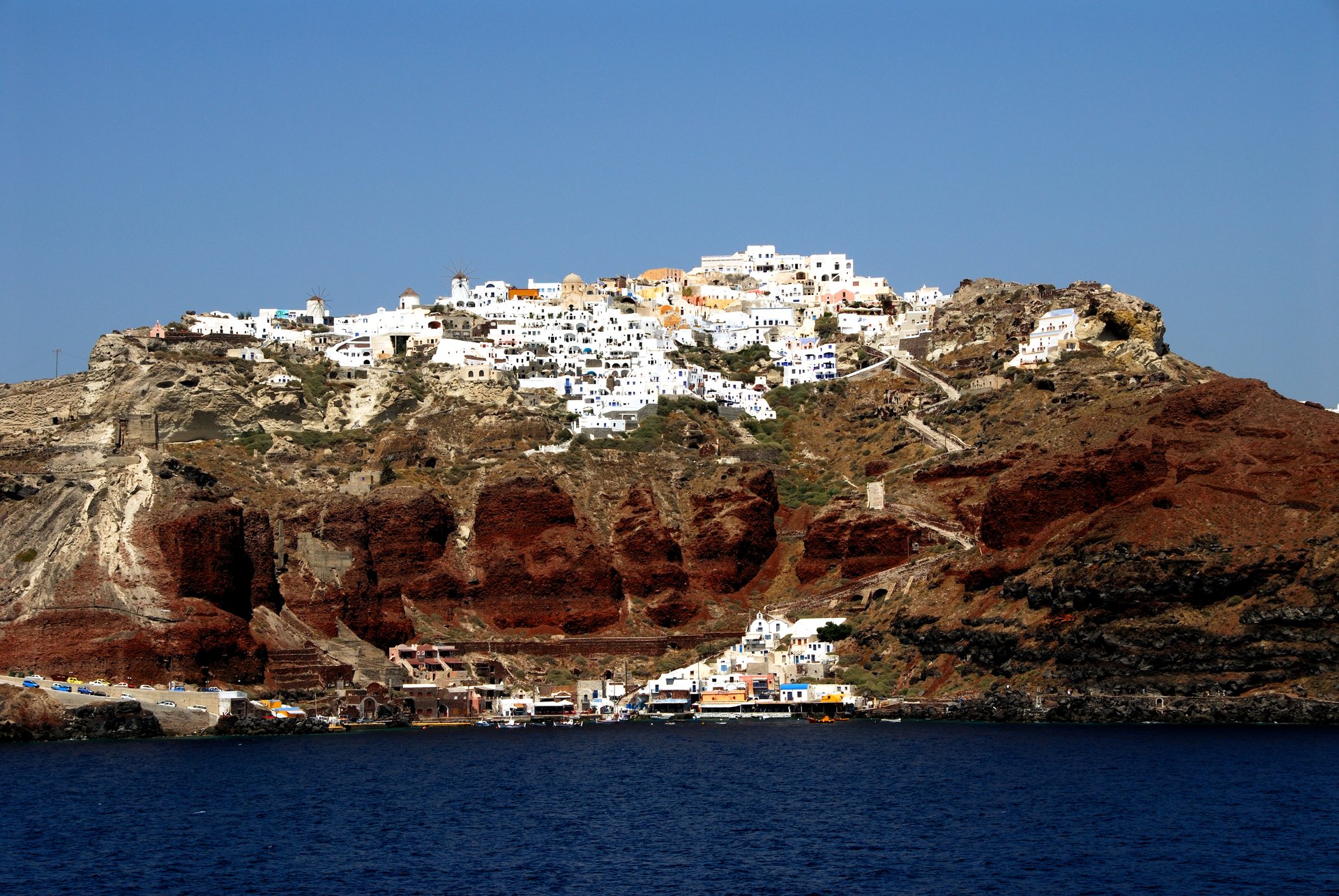 Santorini 聖托里尼從船上看到伊亞港的之字形驢道,高度落差150公尺 走起來會有點辛苦,希臘人真奇怪幹嘛選這種鬼地方居住 每天要出海捕魚還要先練腿力。