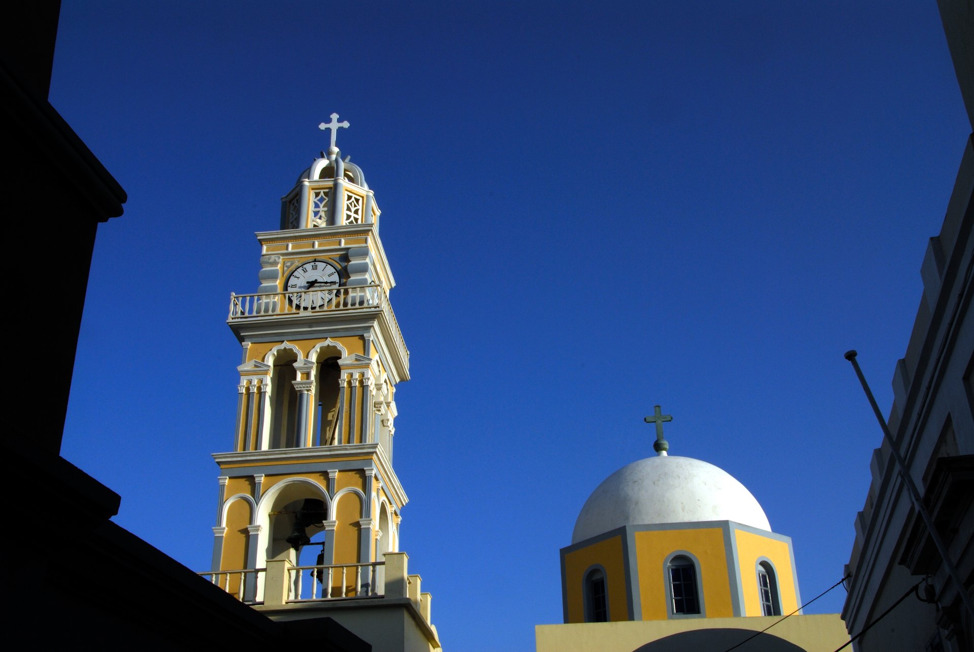 Fira 費拉愛琴海島上迷人的另外一個原因,配色大膽的教堂,黃的很漂亮。