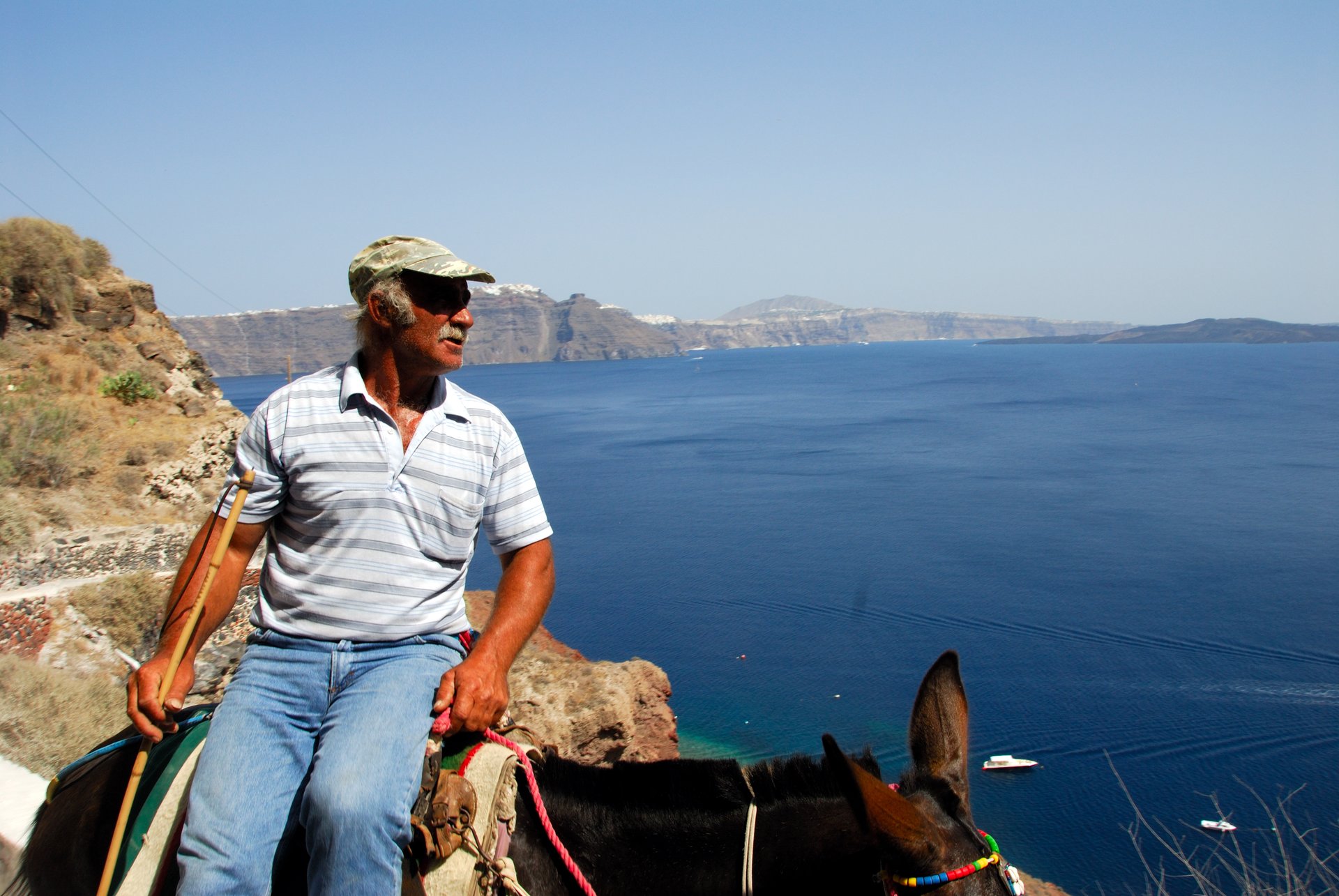 Oia 伊亞驢道上的驢夫,工作很辛苦,時間長還要曬太陽。不過一年只要工作六個月,其他時間可以出國旅遊。