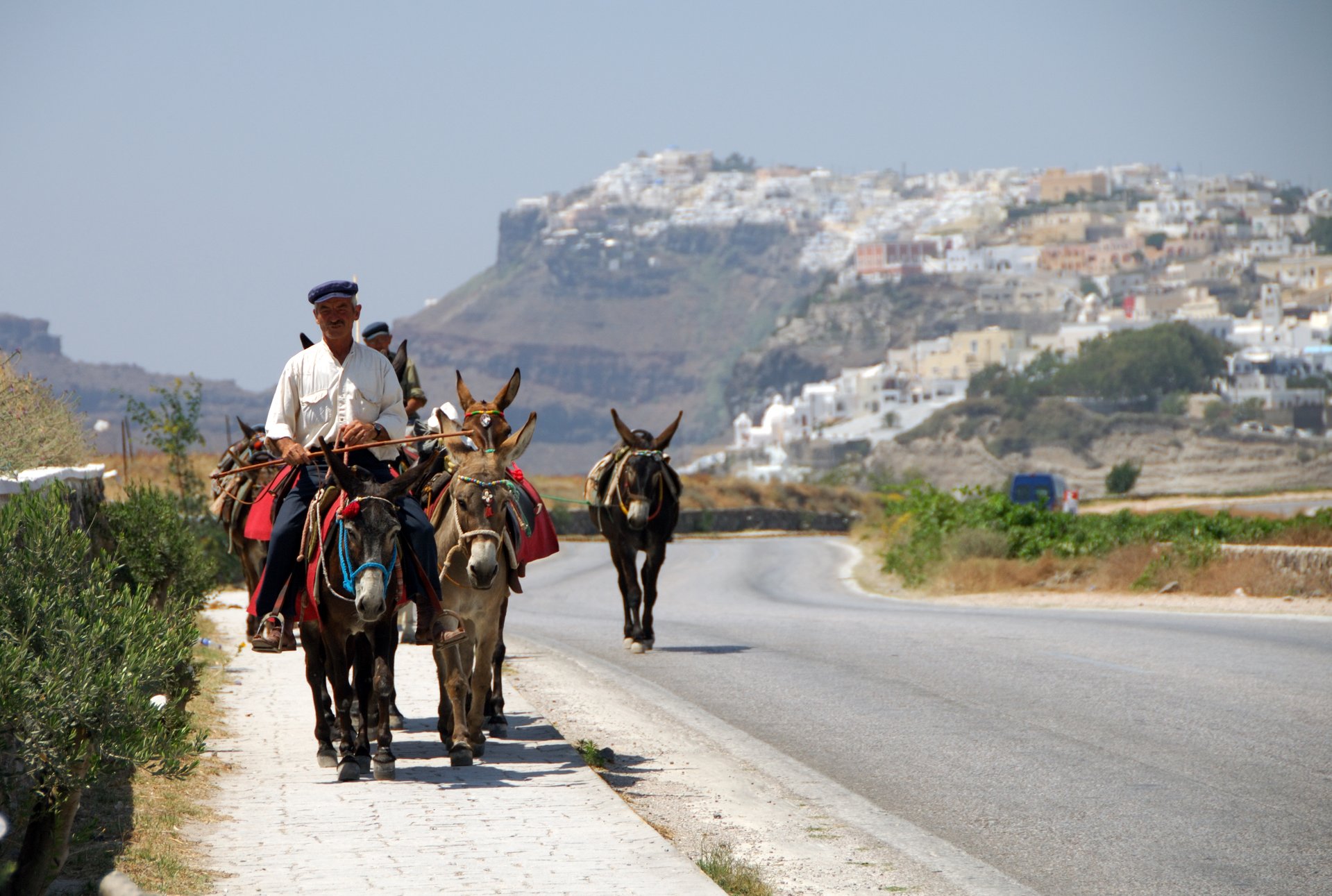 Fira 費拉這一天租著機車逛全島,一離開費拉,就看路旁騎驢的阿伯。馬上停下車來,準備好傢伙,就等他自動入鏡。