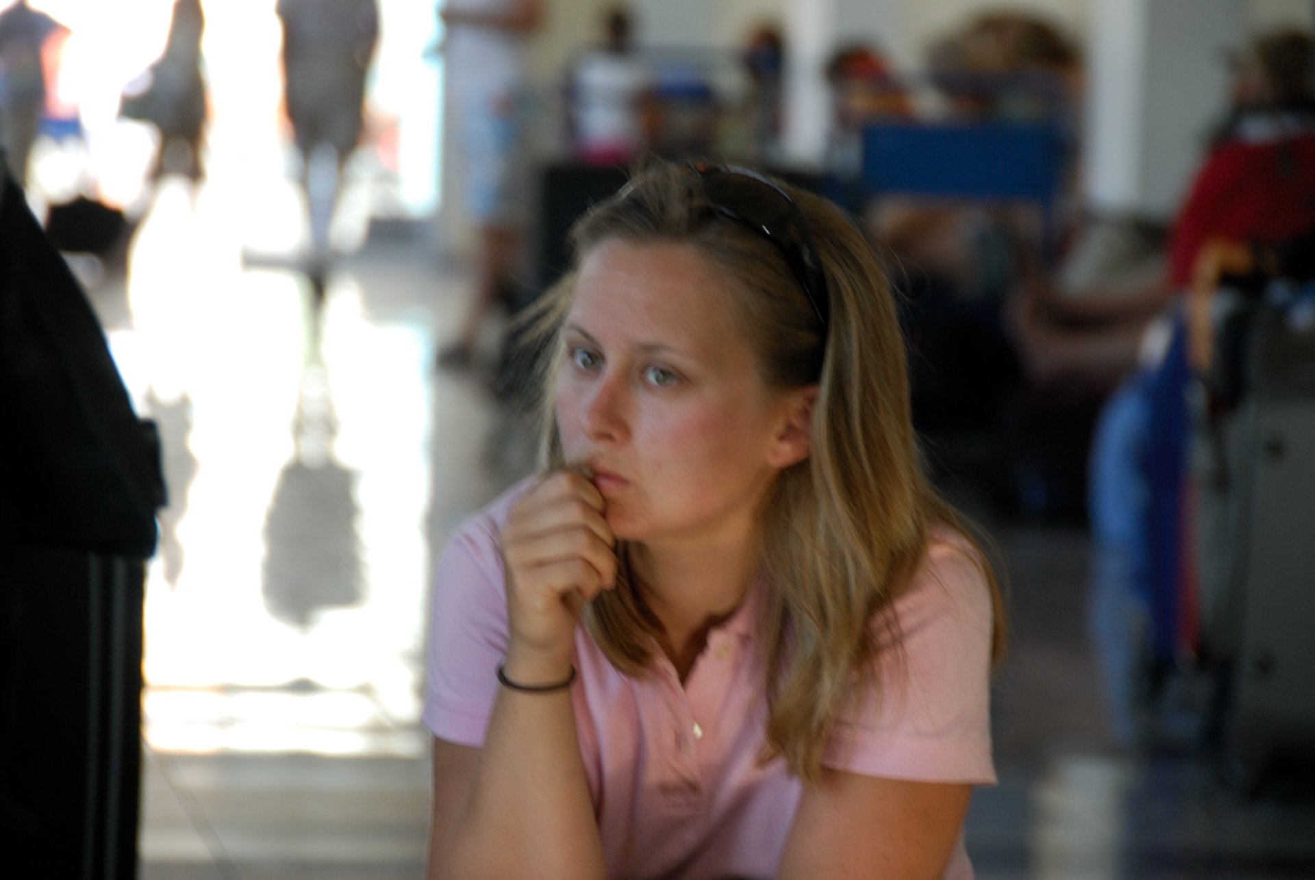 等船時刻,一位女子蹲坐在地上。陽光透過屋頂的天窗照射到地面,光線很自然地擴散到她的臉龐。好像攝影助理拿著反光板打光一樣,遠遠的我偷偷拍下有味道的她。
