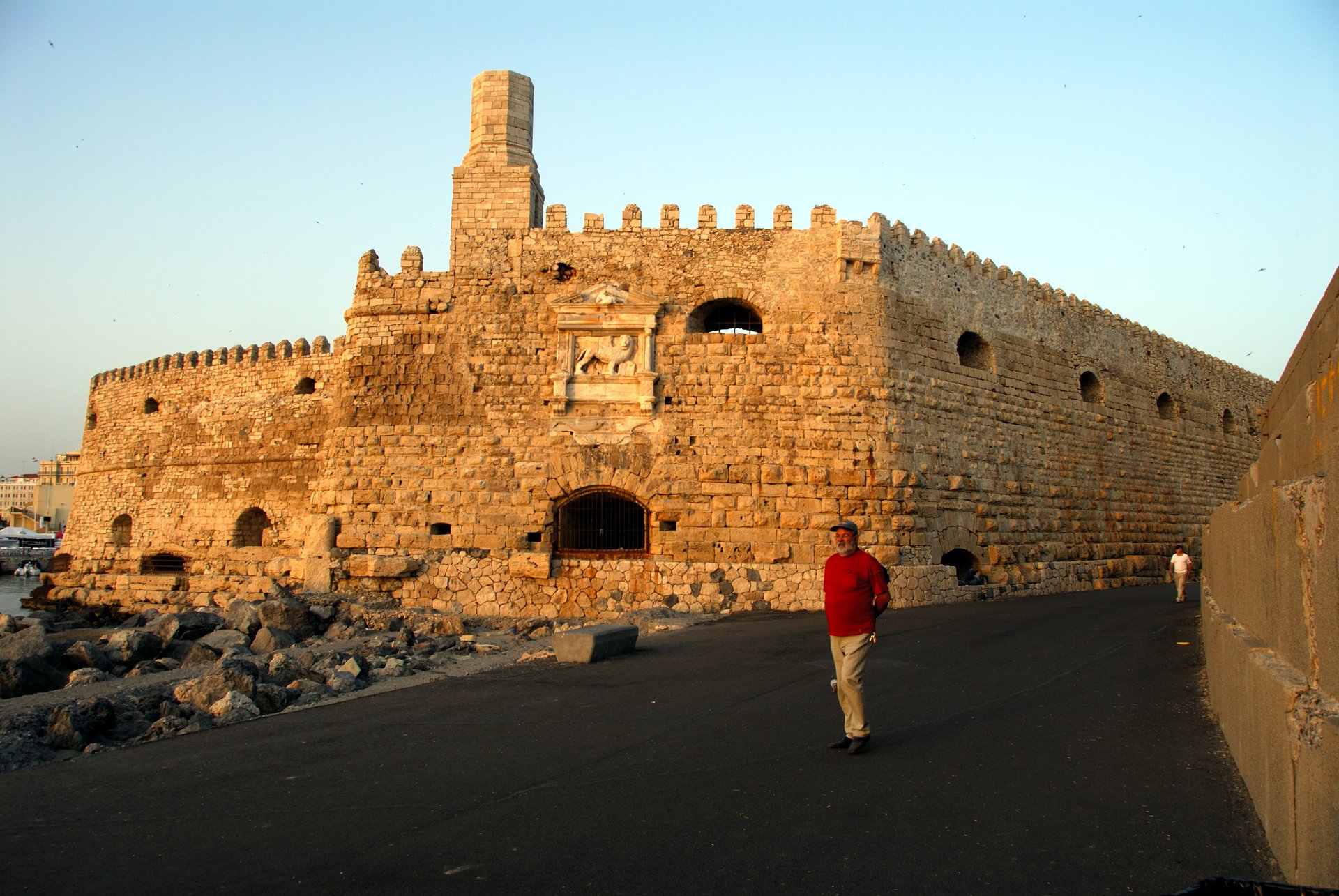 Iraklion 伊拉克里翁清晨裡港灣防波堤旁的城堡,有許多人在晨跑散步。