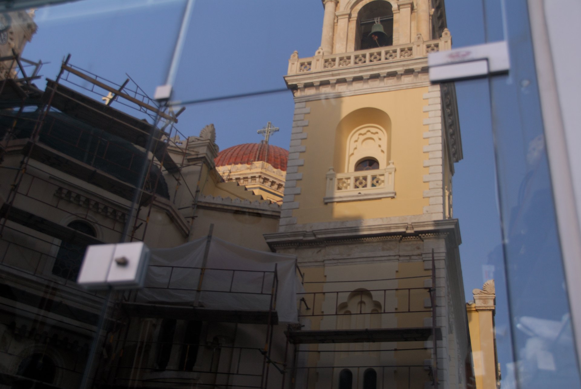 Iraklion 伊拉克里翁商店玻璃櫥窗反映出,聖馬可斯教堂Agios Markos的鐘塔。