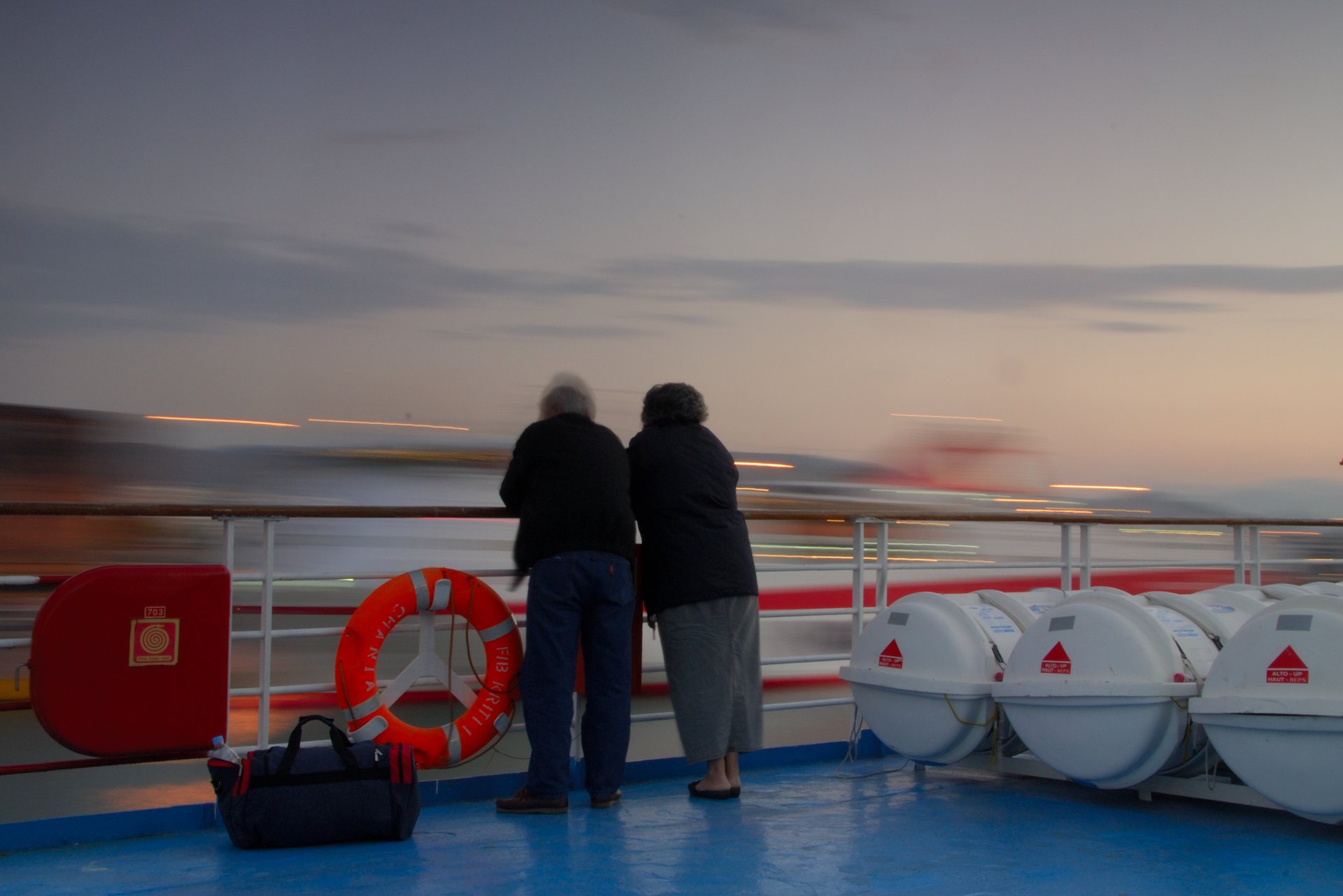 愛琴海上清晨五點,船即將抵達雅典。一對早起的夫婦,已經在甲板上等待日出。