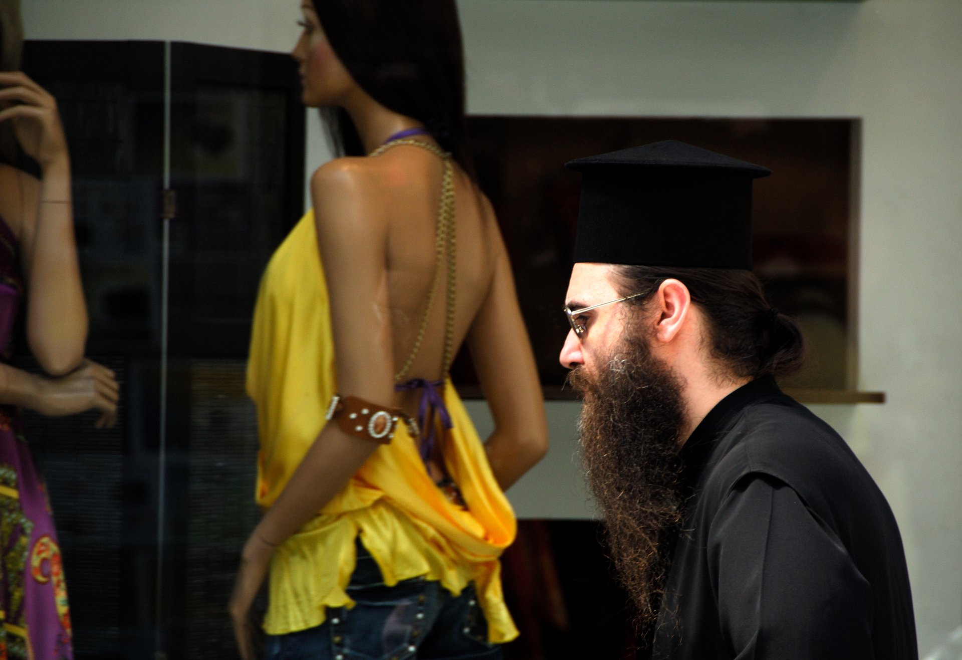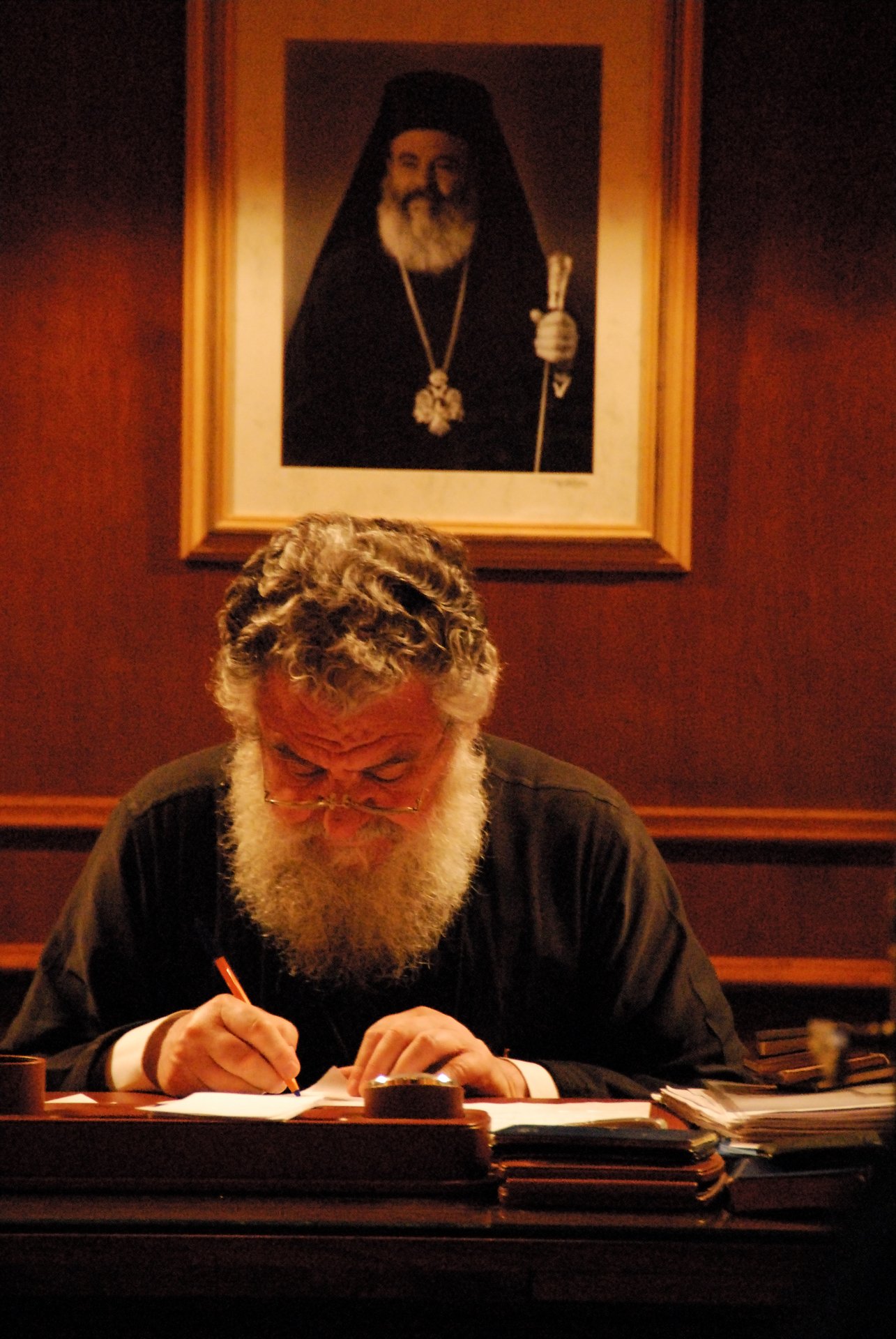 Athens 雅典東正教教堂內,一位教士正忙的紀錄信徒來電的託求,我從遠處拍下這莊嚴的畫面。