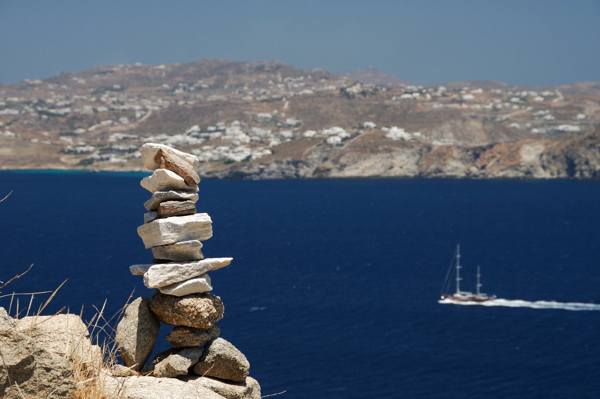 Delos提洛島山頂上往東北方看Mykonos實在很近,好像每個地方的山頂上都會有人擺石堆。