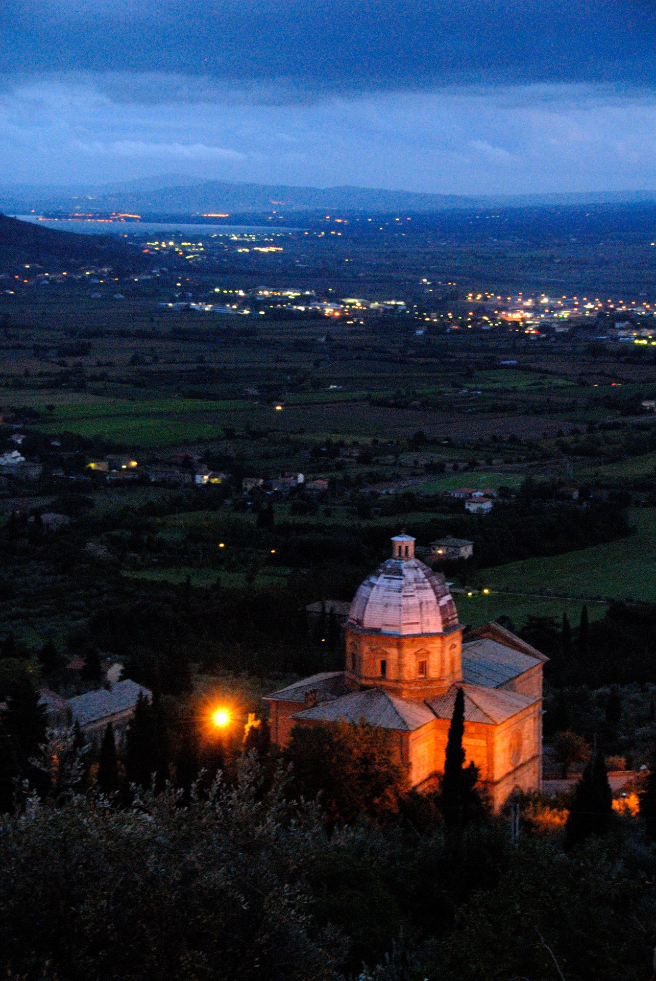 Cortona 科托納當聖母瑪利亞教堂的燈光緩緩亮起,遠處加達湖面還映著夕陽微弱的光芒,丘陵上點點燈影有如天上繁星,托斯卡尼呀!我終於來了。