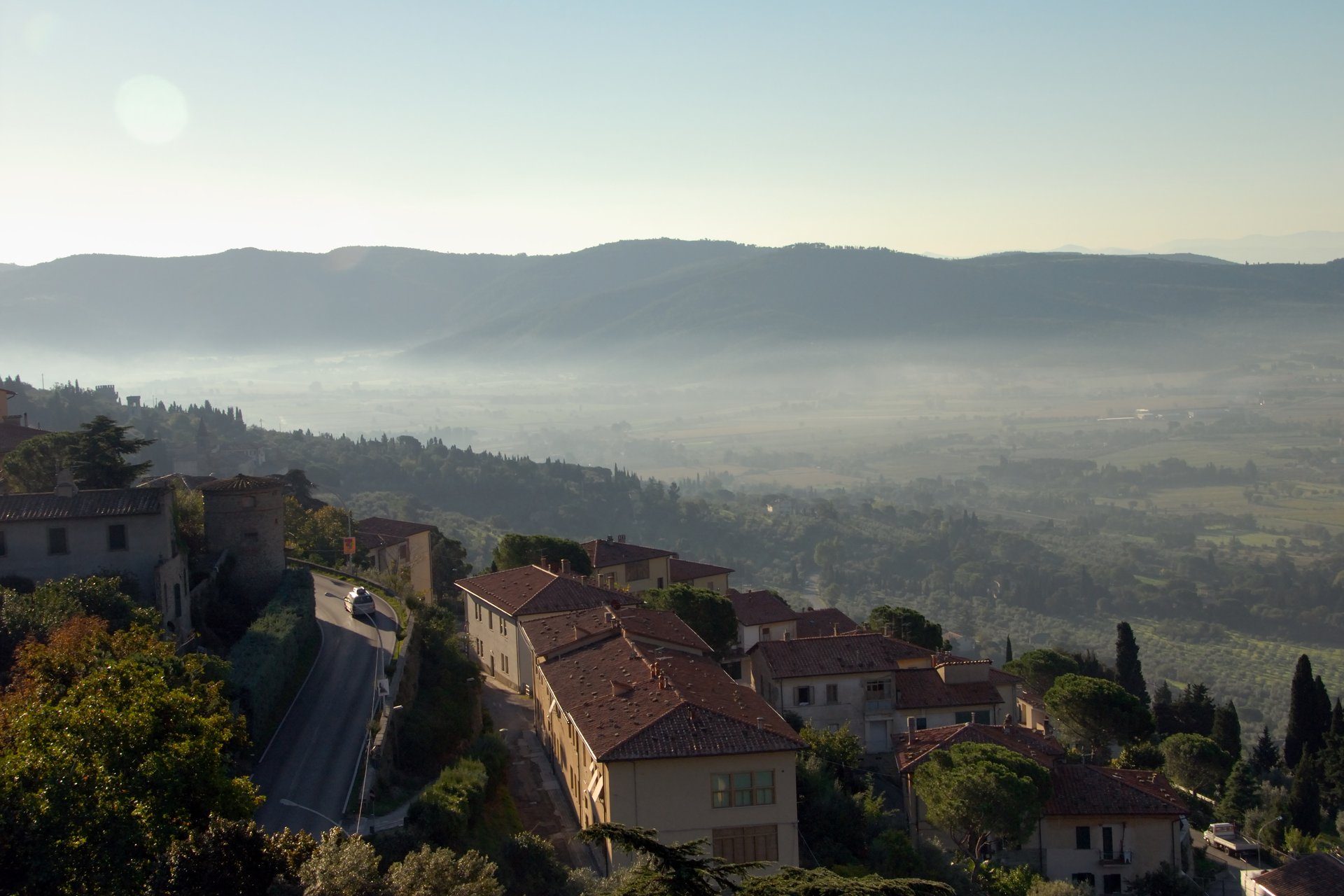 Cortona 科托納太陽剛升起,遠方晨霧飄渺,托斯卡尼才剛剛甦醒。