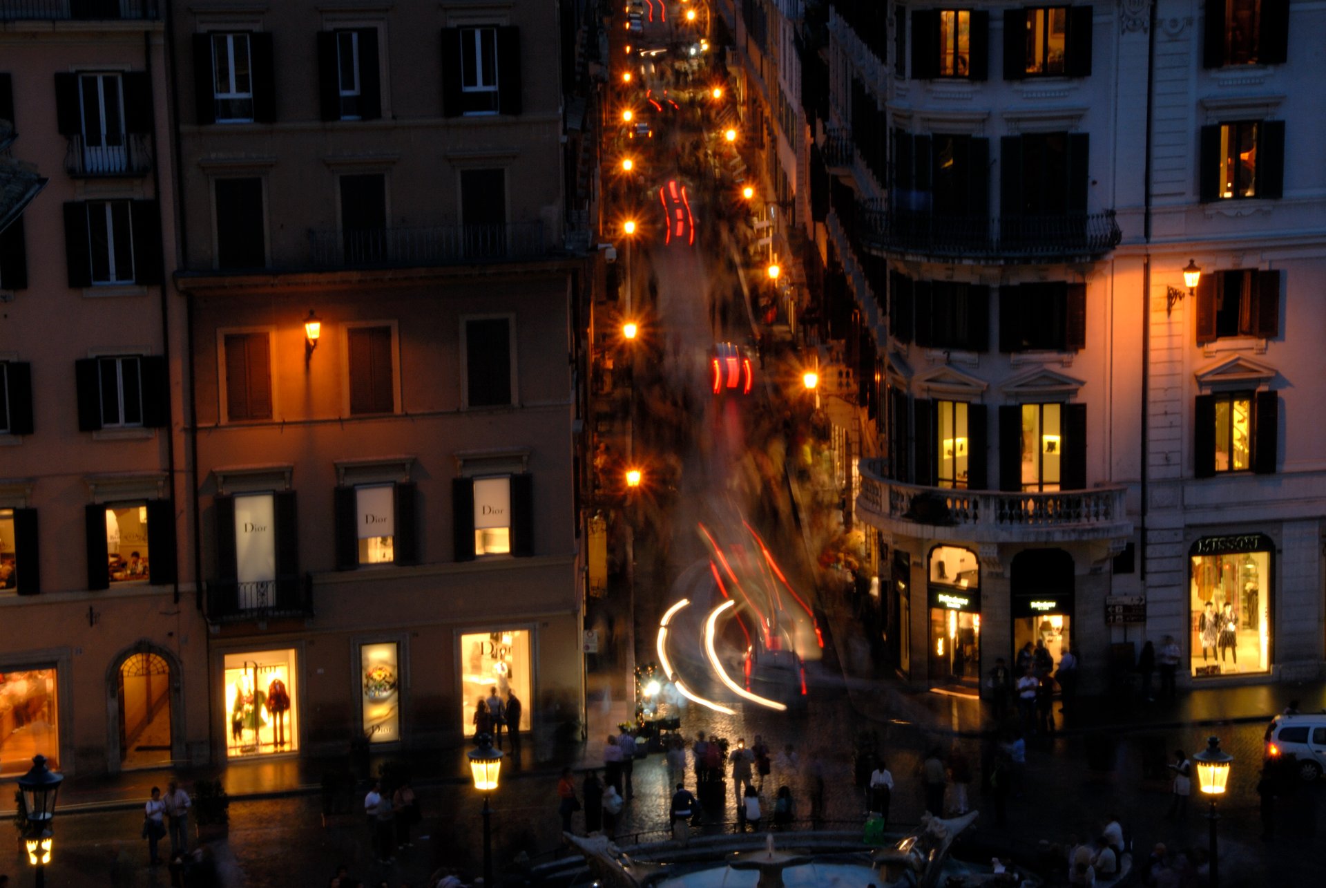 Rome 羅馬 西班牙廣場西班牙廣場的夜景,因為三一教堂鐘塔維修中,包的很難看,只好轉向,改拍康多第街(via condotti)的夜景。