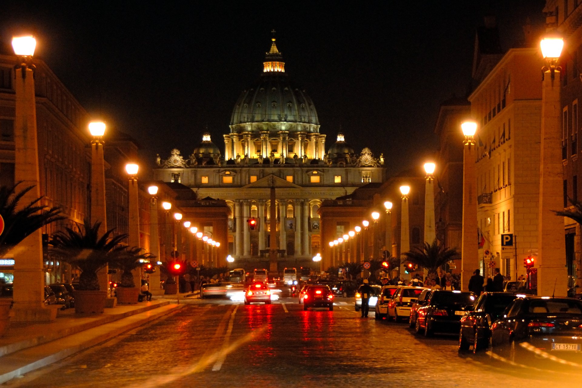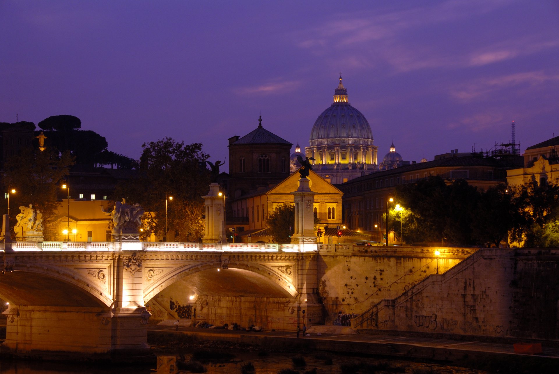 梵諦崗 聖彼得大教堂從聖天使堡前的橋上回頭望著聖彼得大教堂,夕陽裡打著燈光的教堂,更顯得莊嚴肅穆。