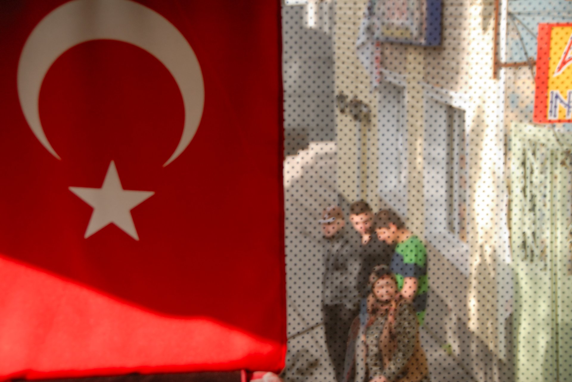 Kars 卡爾斯非常愛國的土耳其人,到處都懸掛國旗,連我們遊覽車上也有一幅。這一天中午吃飽飯上車,發現車後站了幾個人,透過隔熱紙網孔我拍下這張很特別的相片。