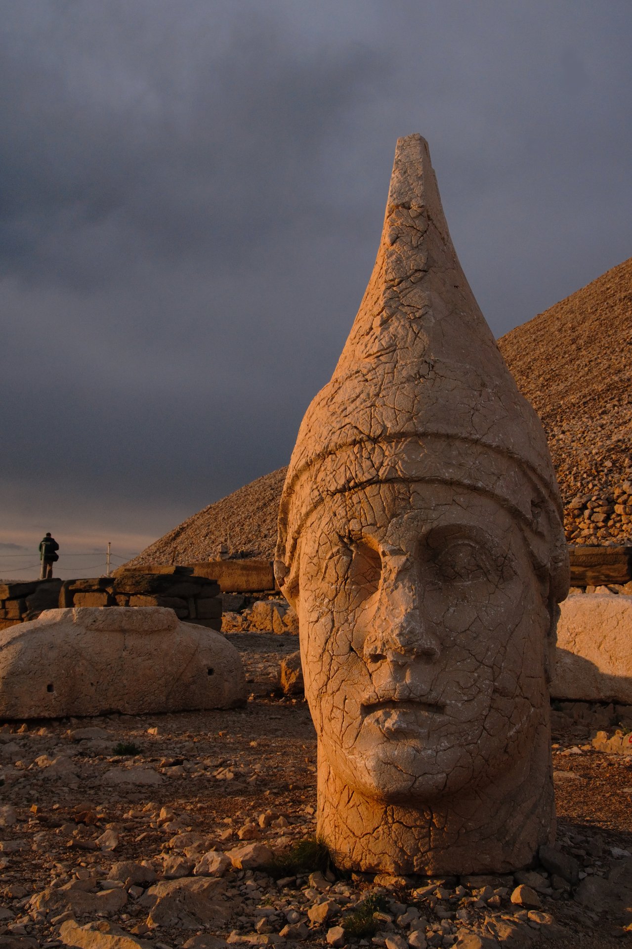Nemrut Dag 人頭山海拔2134高的山頂上,有座2000年前建立的陵墓和祭壇,還有高大的石像。由於地震與偷工減料的關係,石像早已毀壞,可是頭還在,這些人頭成為土耳其東部最吸引人的景觀。
