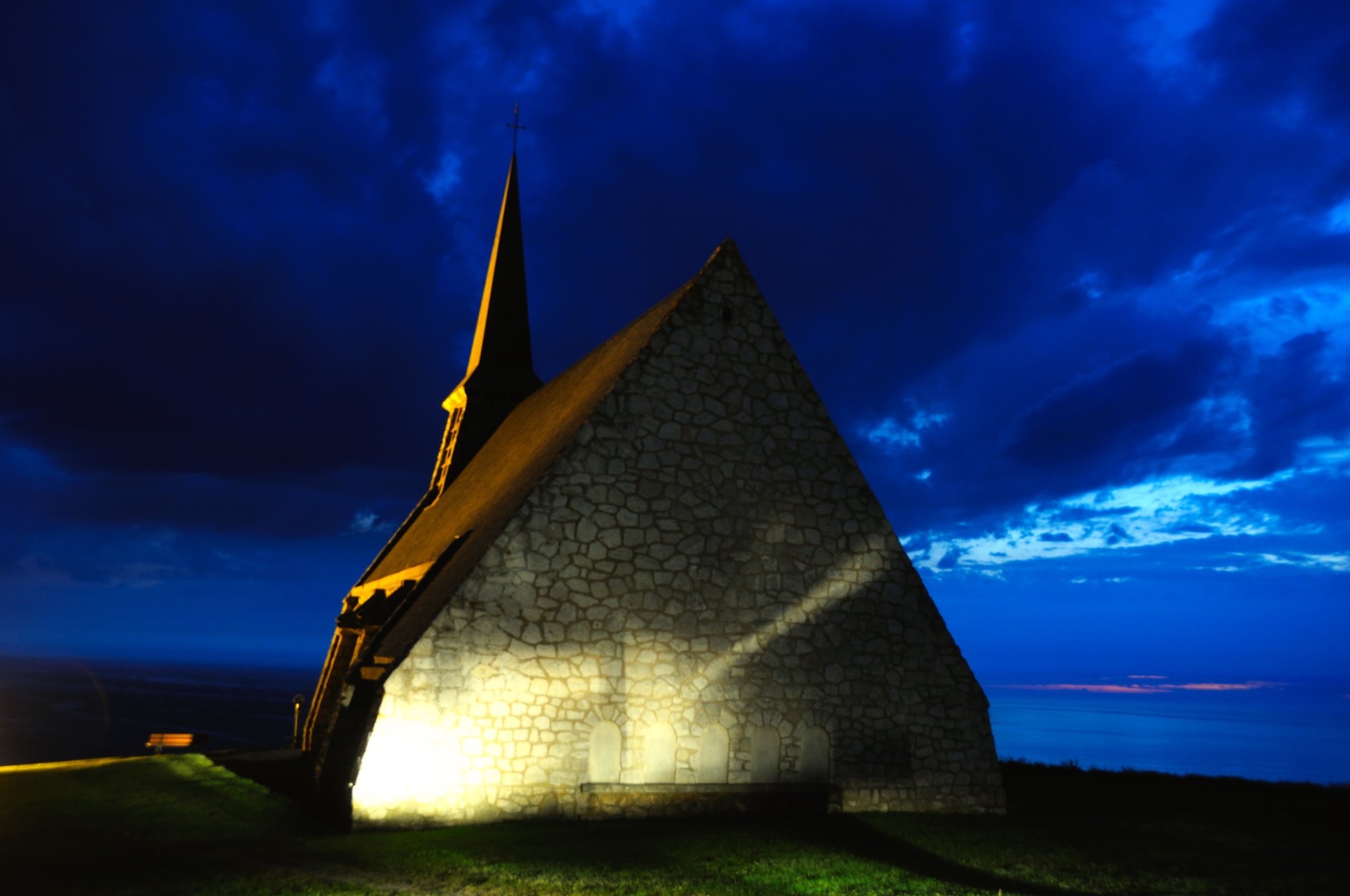 象鼻海岸Etretat海岸邊山坡上的小教堂,夜裡點著燈,照出旅人的方向。