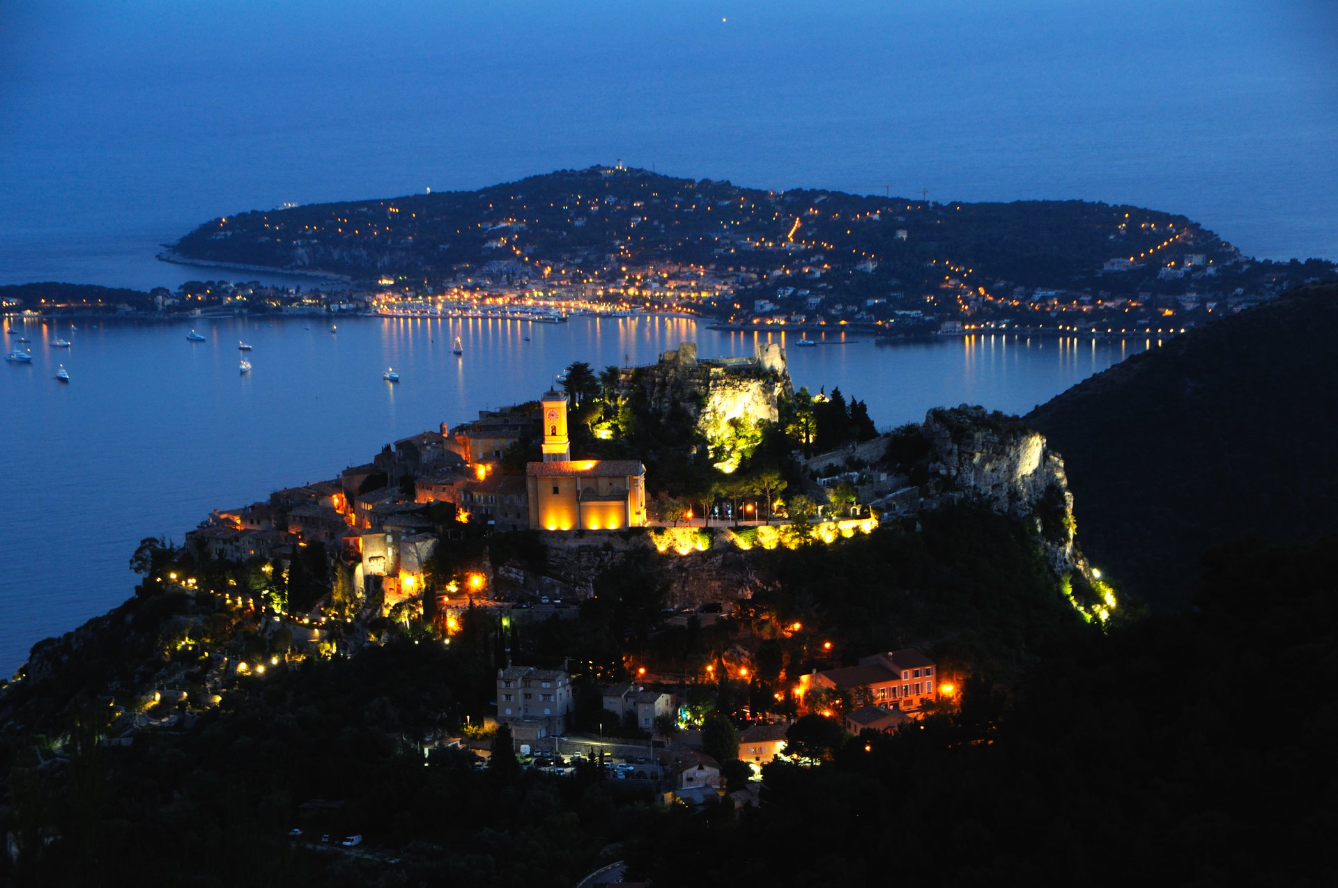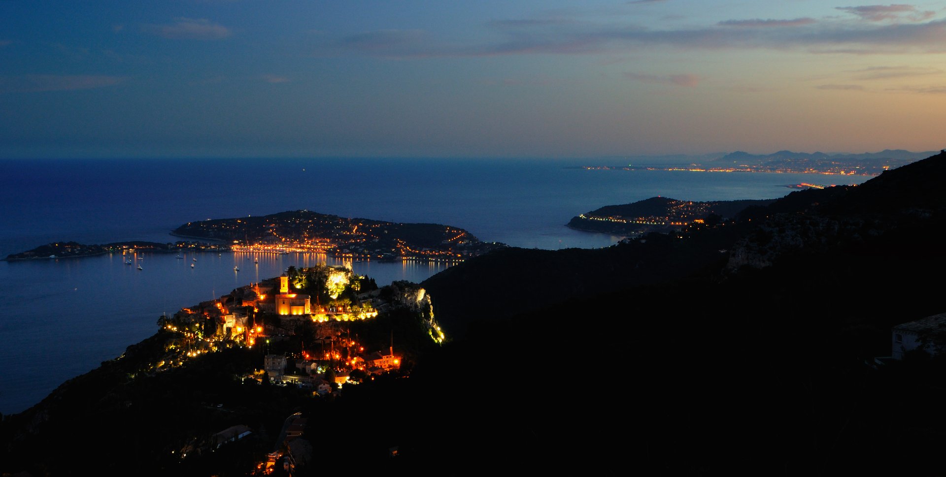 艾茲Eze從山頂上看夜景,蔚藍海岸一覽無遺,近處的是Eze,遠處的是尼斯Nice,最遠方的是安提布Antibes。