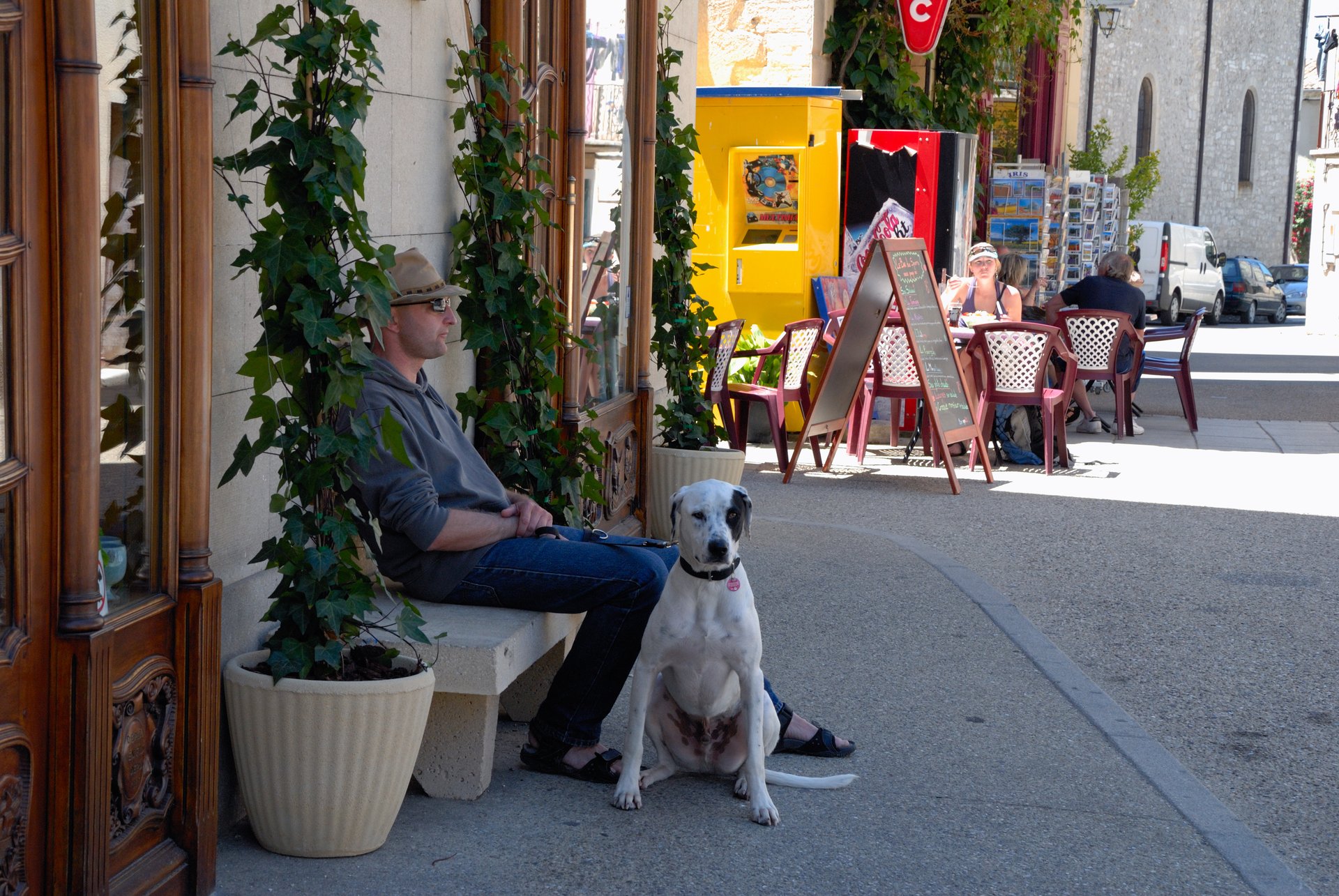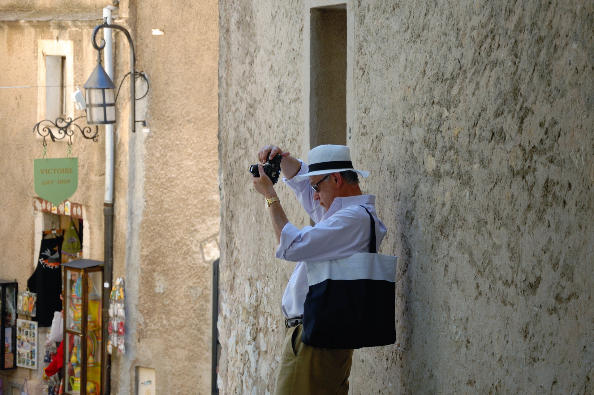 Moustiers-Sainte-Marie悠閒的周日,阿伯在歐舒丹店門口看報紙,等待入內血拼的老婆。