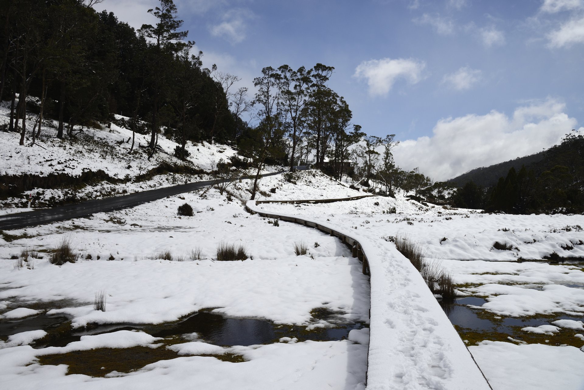 Cradle Mountain 搖籃山國家公園鴿子湖畔小徑,積雪一片。