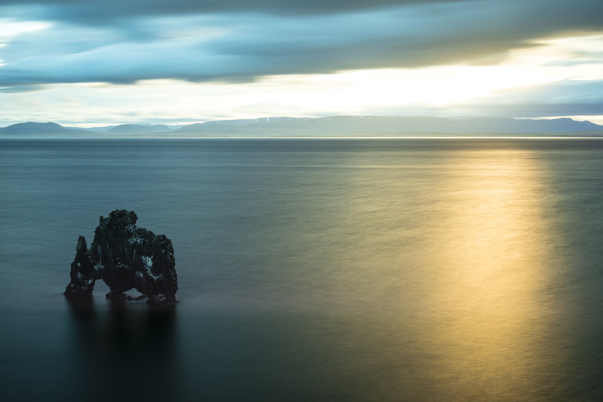 犀牛石Hvitserkur Troll延長時間的曝光,讓海面平緩無波,犀牛恍彿睡著了。