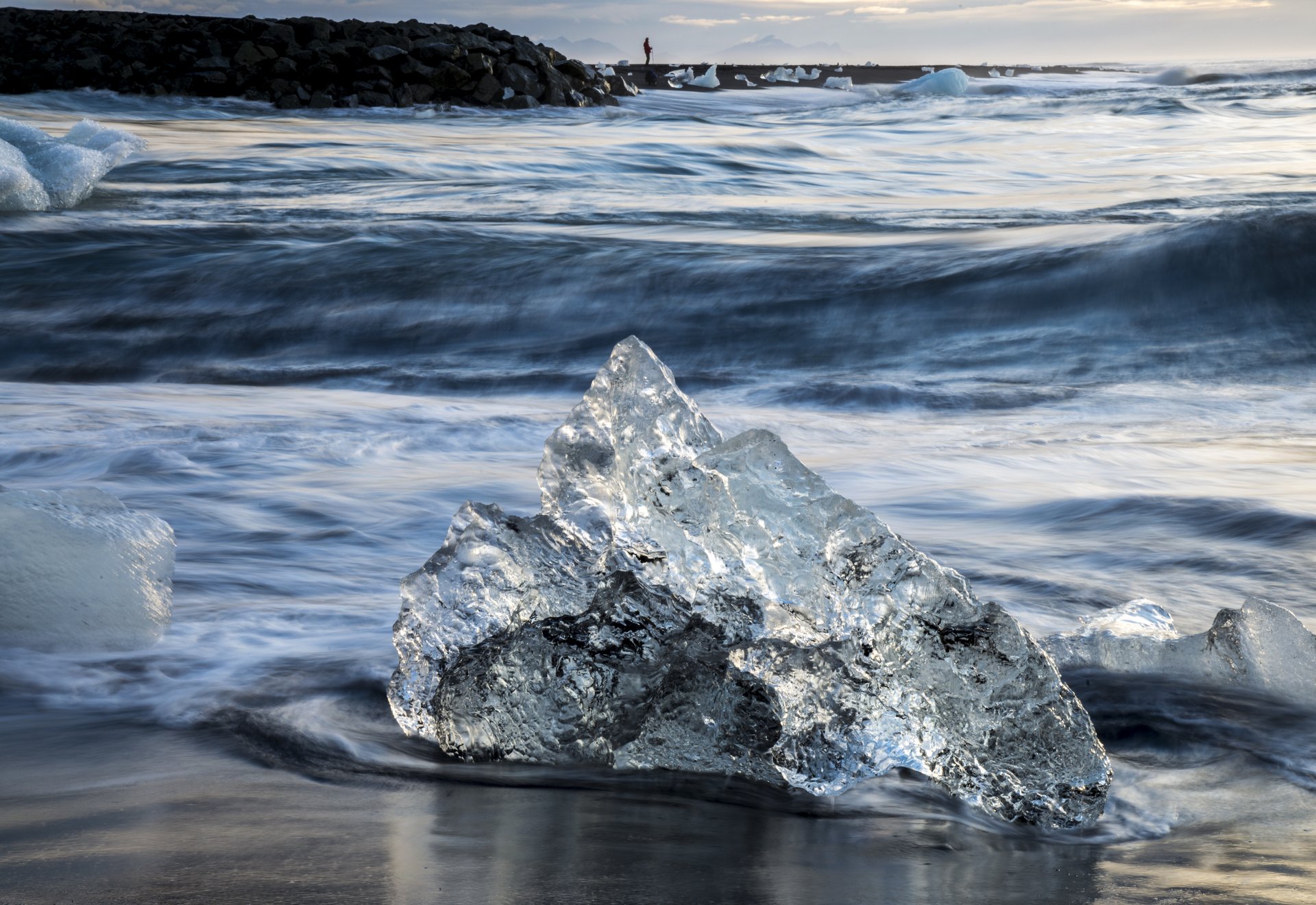 Jokulsarlon Lagoon 冰河湖浮冰沿著湖邊的出海口,漂浮到海面上,沒漂遠的冰塊又被浪花推回海岸邊,累積後就形成了這個奇妙的冰塊沙灘。