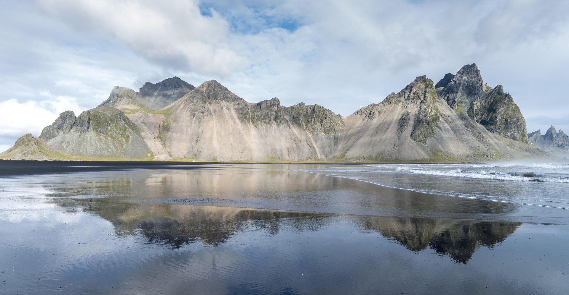 Vesturhorn Mountain這是冰島旅行中印象深刻的山峰之一,聳立在海邊漲潮時平整的沙灘,就會形成完美的倒影。