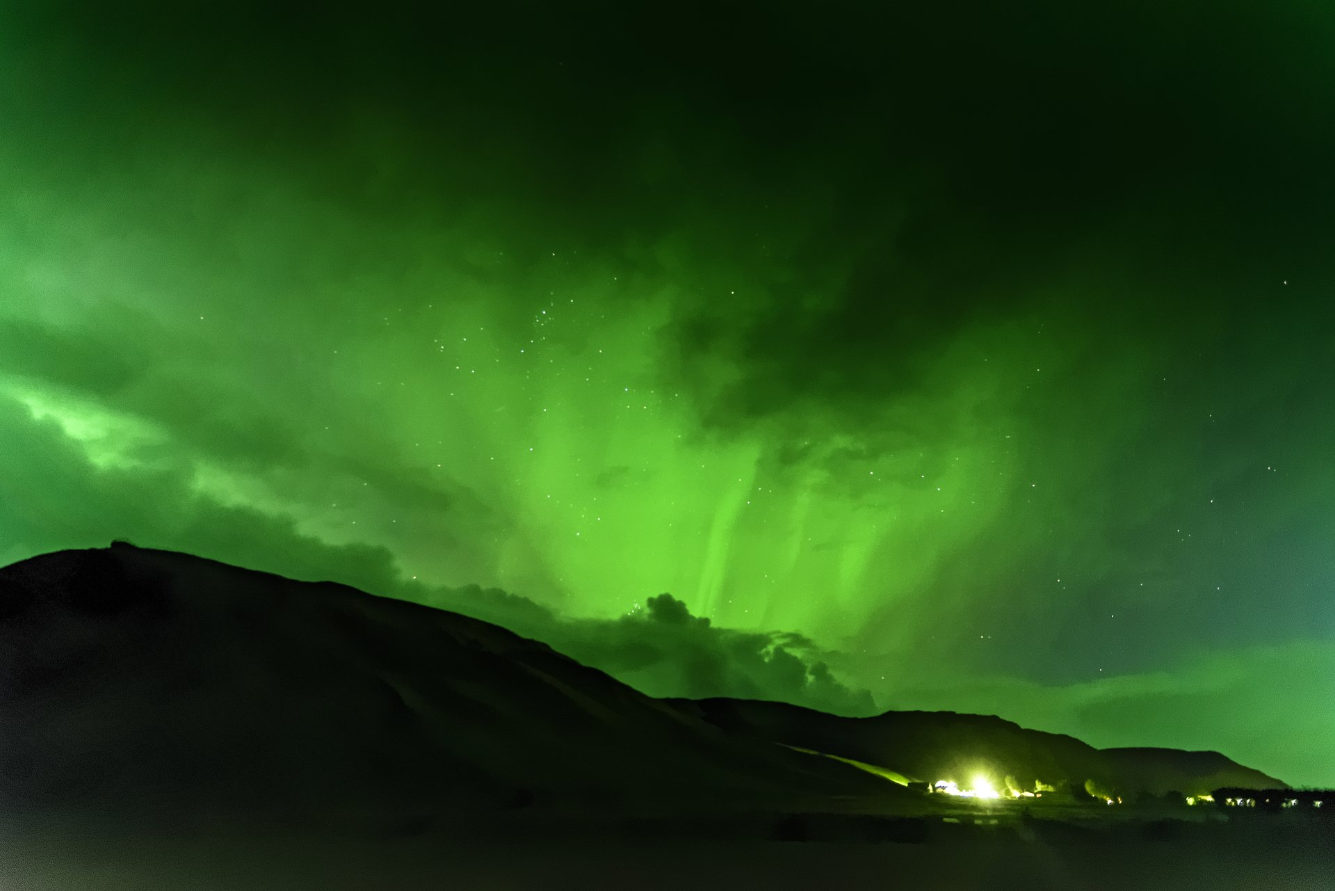 Kirkjufell 教堂山深夜裡雲很厚,極光一點點的透過雲縫跟我打招呼。