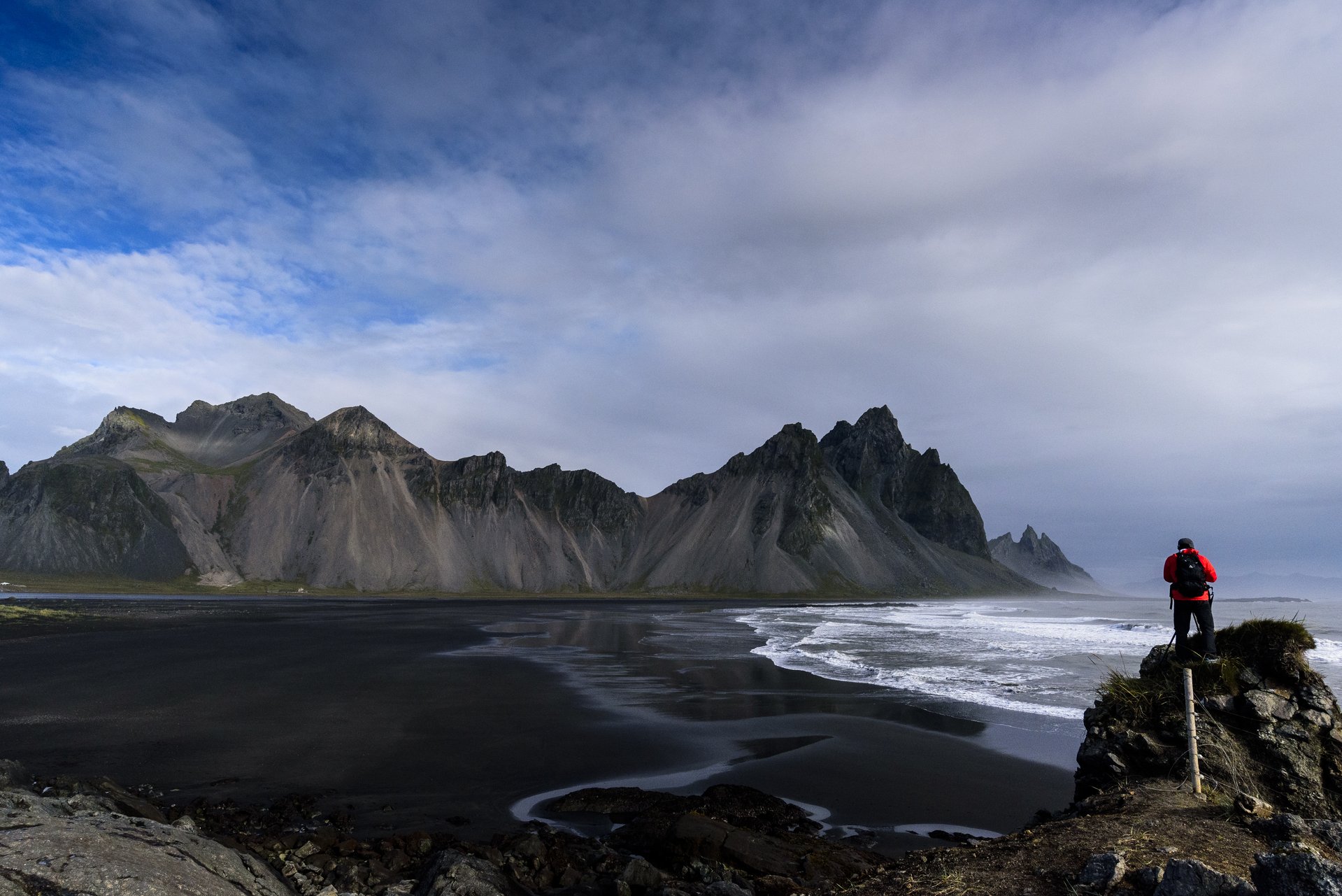 Vesturhorn Mountain我爬上岸邊小丘,認真拍照,殊不知黃雀在後。