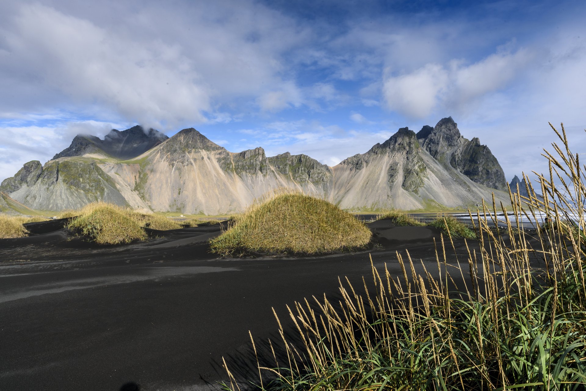 Vesturhorn Mountain黑沙在強風吹襲與沙草保護的作用下,形成了一座座的小土丘。