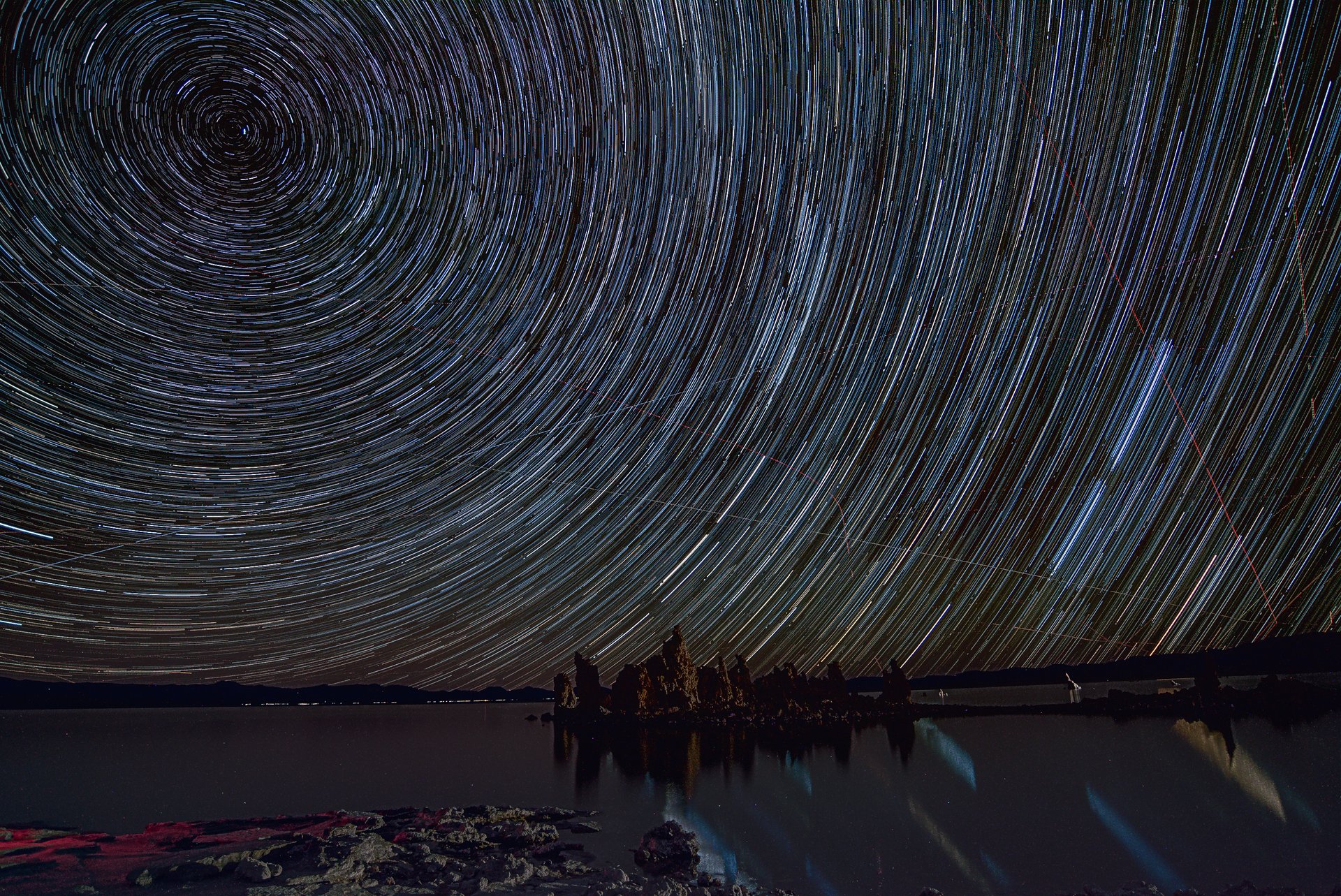 Mono Lake莫諾湖莫諾湖的星空很熱鬧,飛機偶爾會來插花一下。這是2個小時拍240張星軌照,後製軟體疊起來的成果。