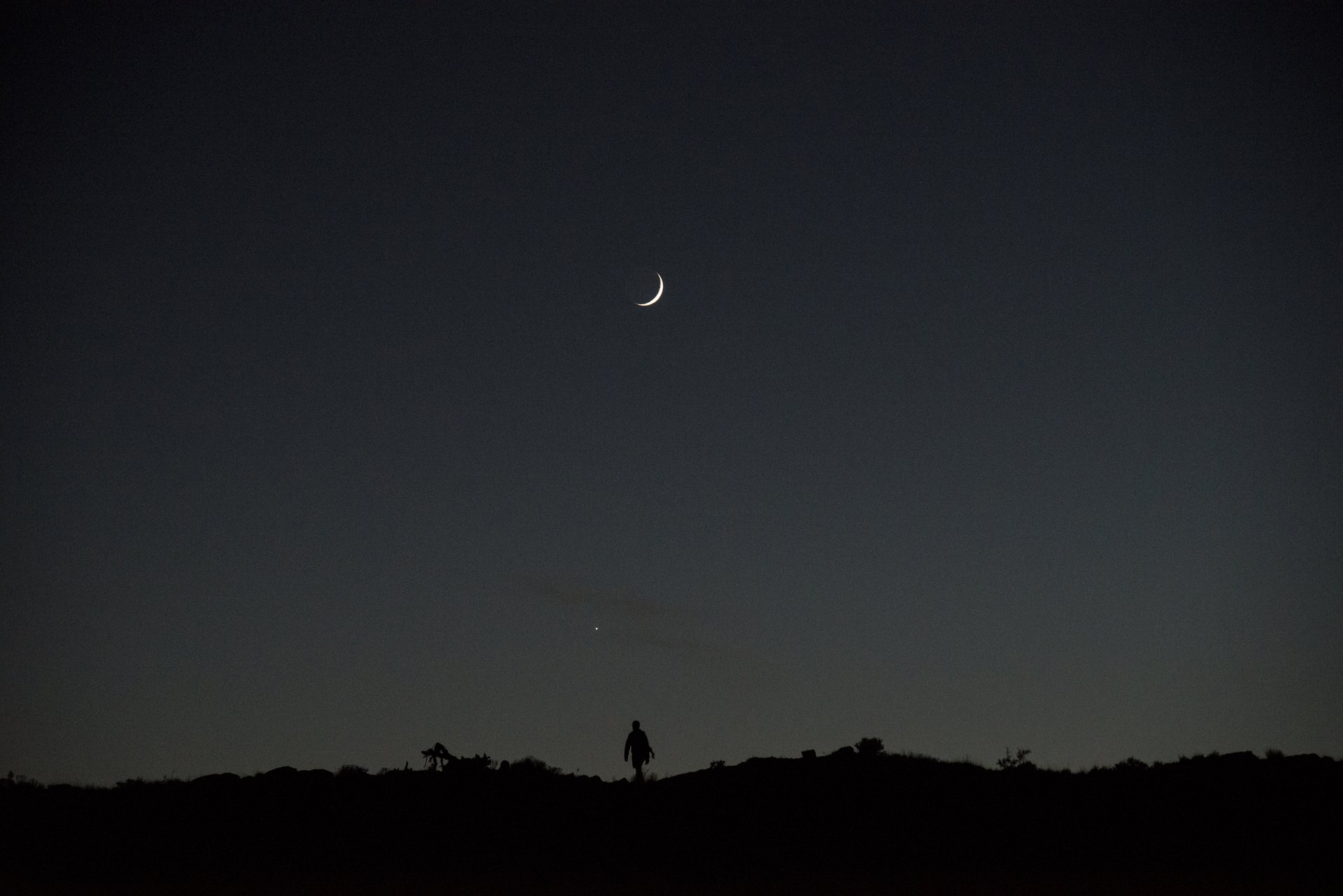 Arches 拱門國家公園看完Delicate Arch精緻拱門夕陽後,還要走一個小時回停車場。天一黑彎月就掛上山頭,我等了一會兒,有個旅人走進我想回家的畫面裡。
