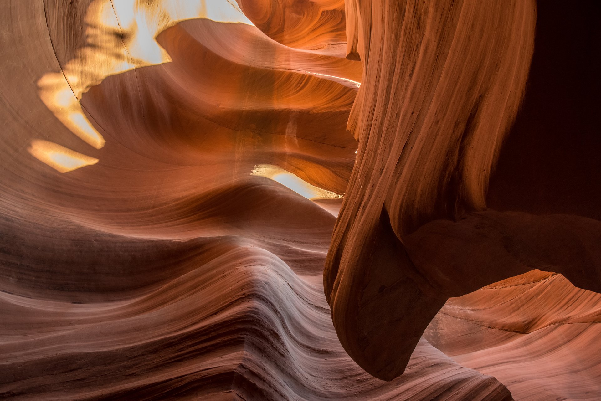 Lower Antelope Canyon下羚羊峽谷光線從峽谷上方縫隙進入,反射在谷壁表面,層次分明。