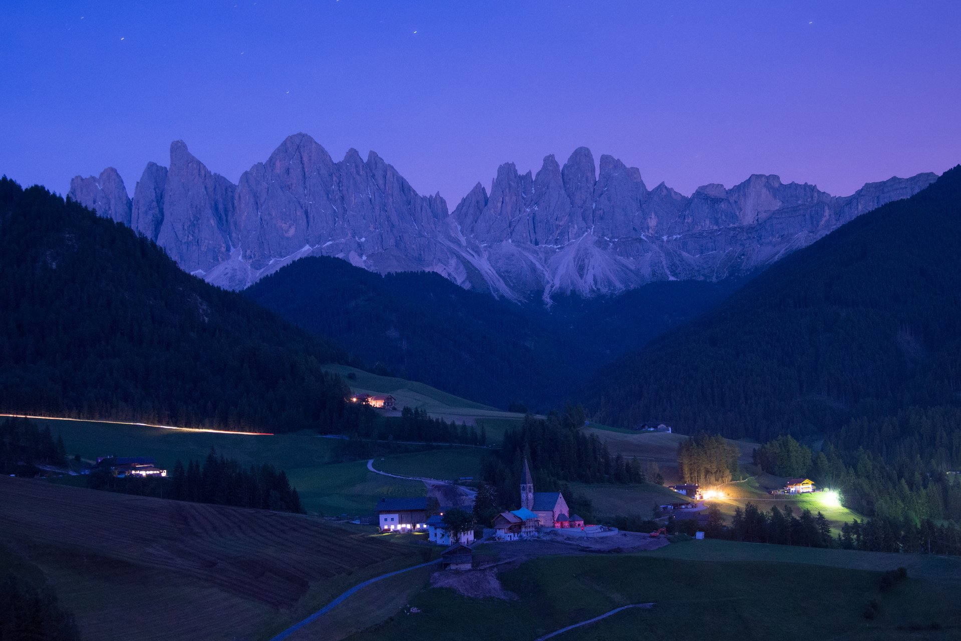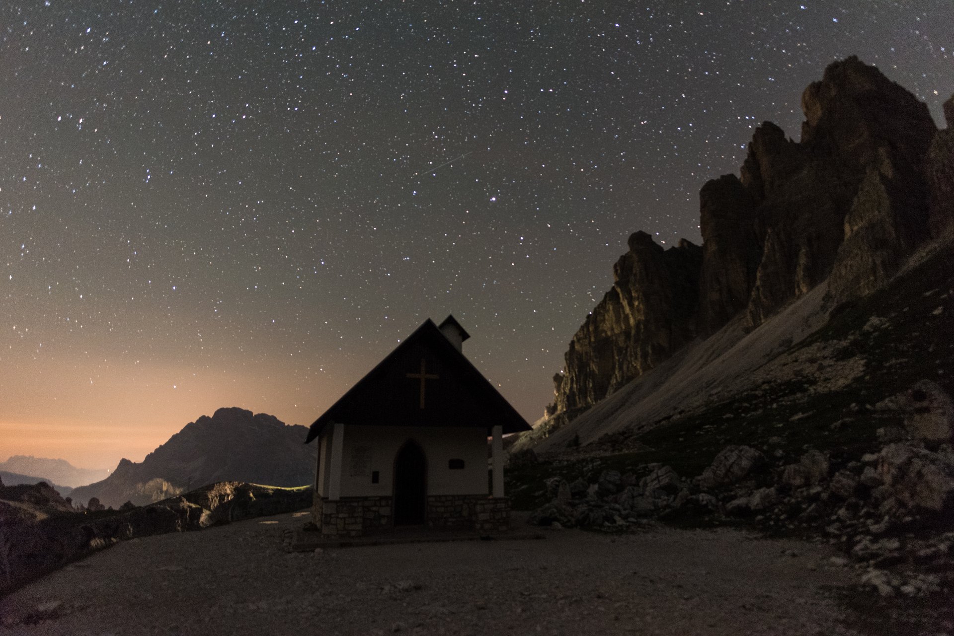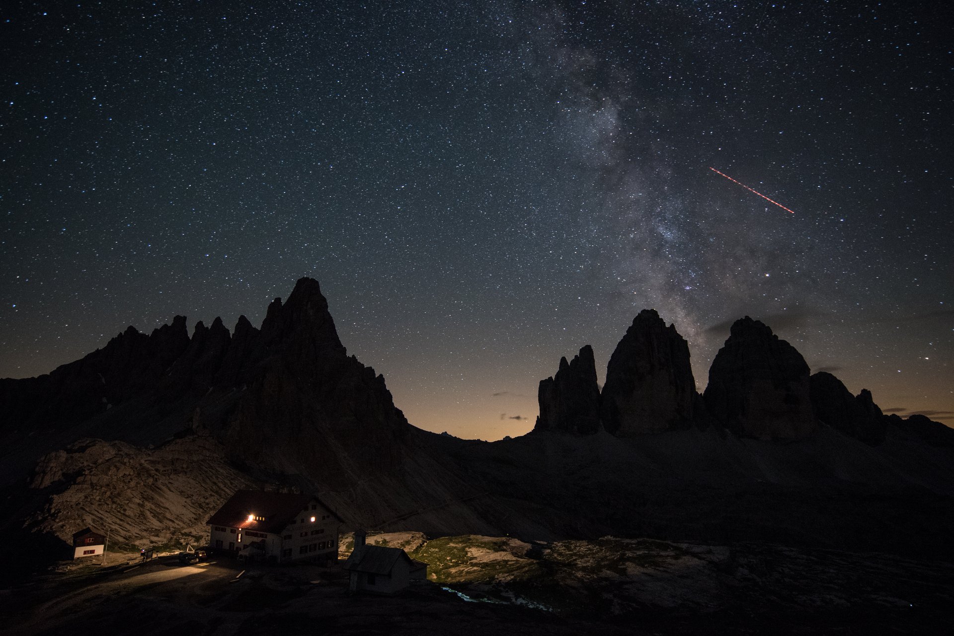 Tre Cime di Lavaredo夜裡的三間峰山區很熱鬧,銀河星空與山莊燈光相互輝映。
