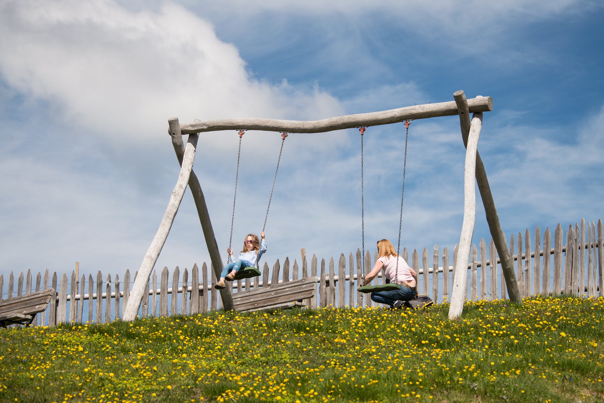 Odle Mountain山頂纜車站旁,媽媽陪著小朋友在盪鞦韆。