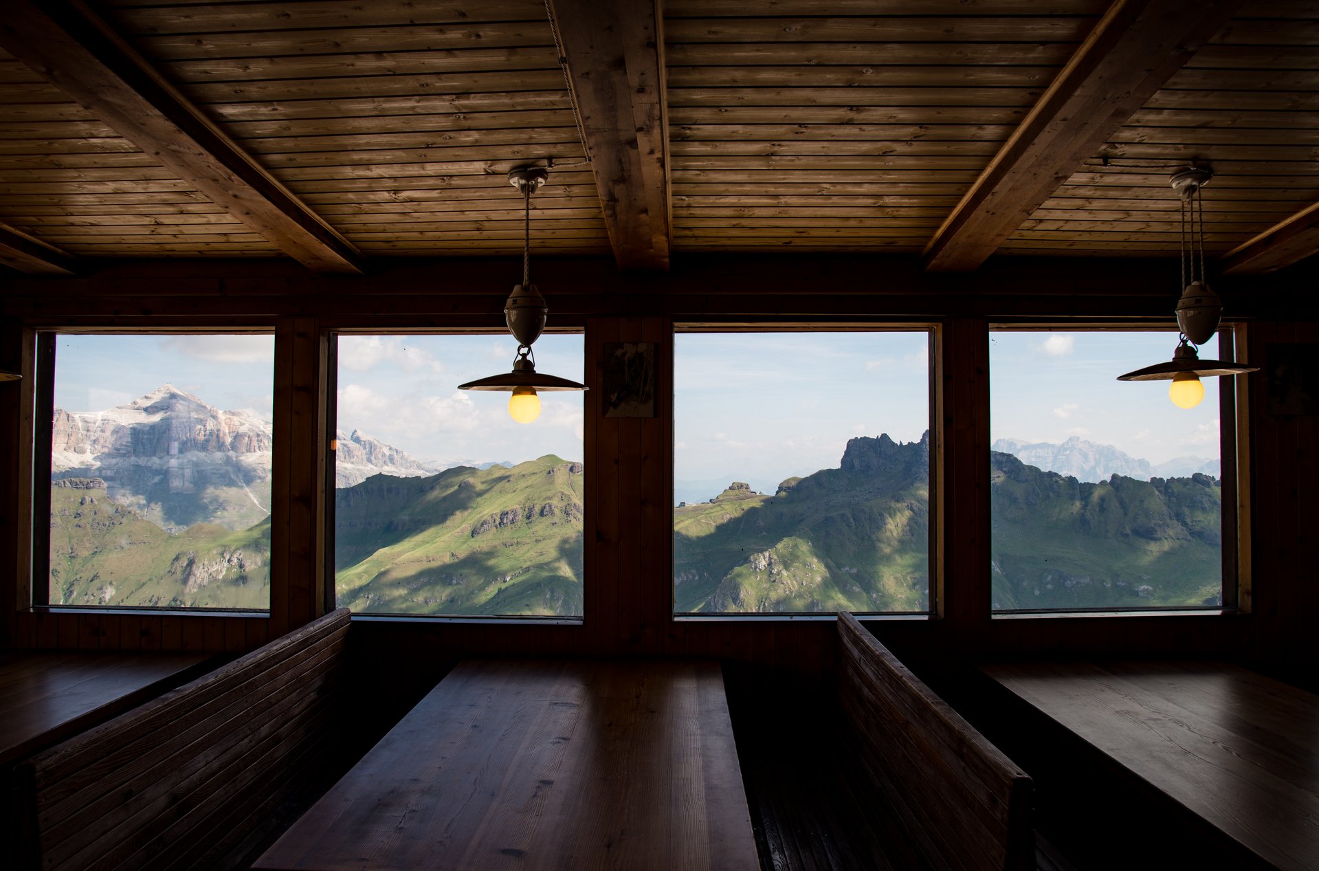 Fedaia山頂木屋供遊客休息用餐,開闊窗戶外的風景,美的不像話。