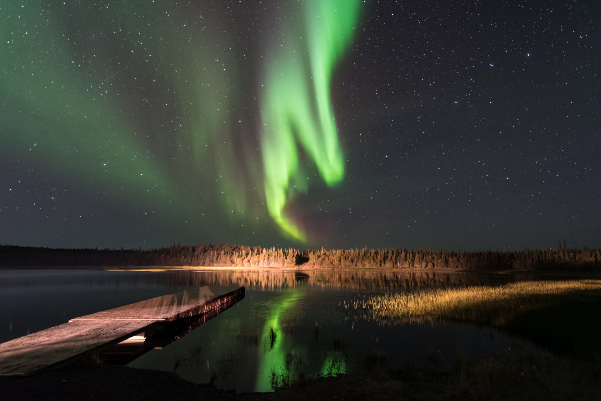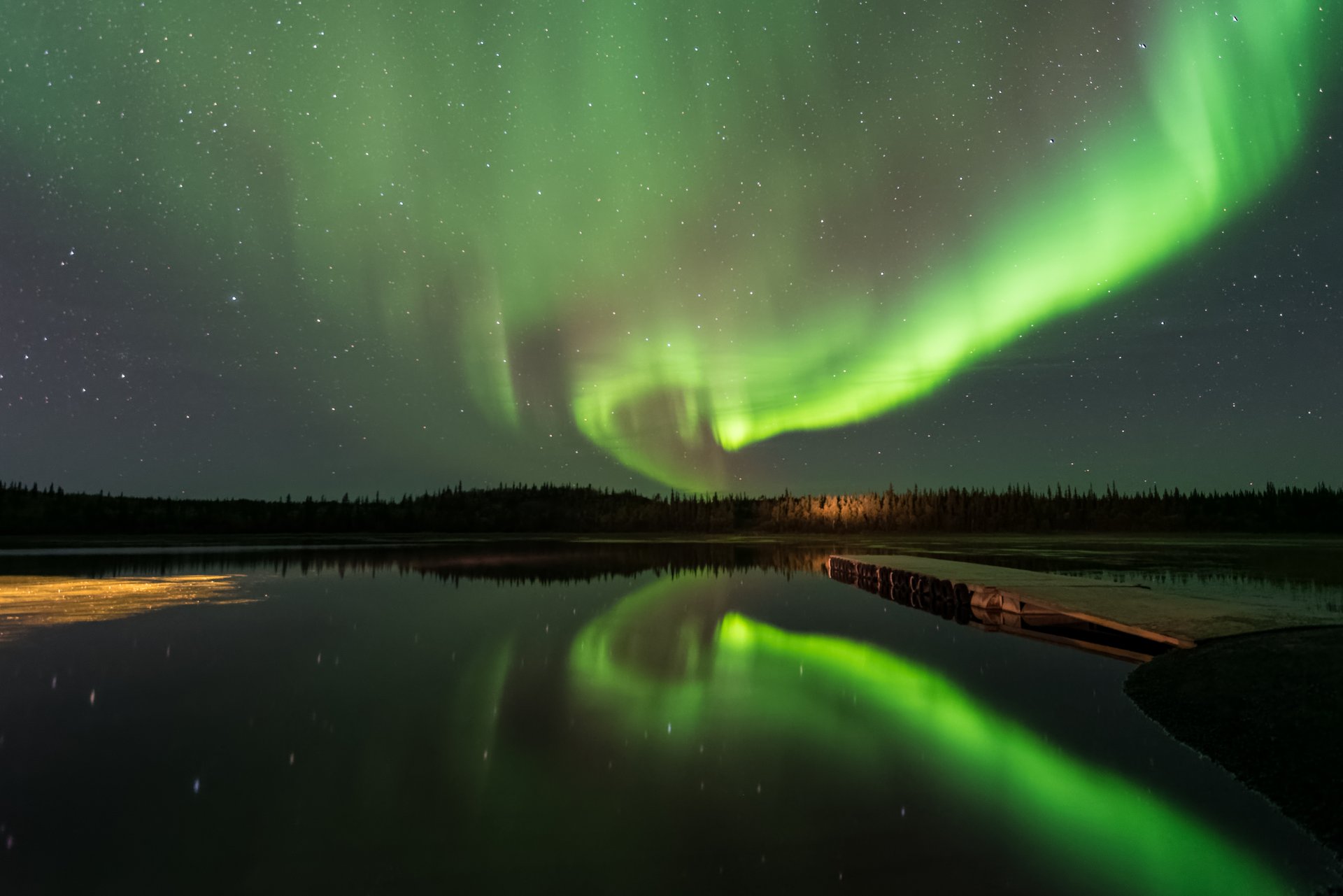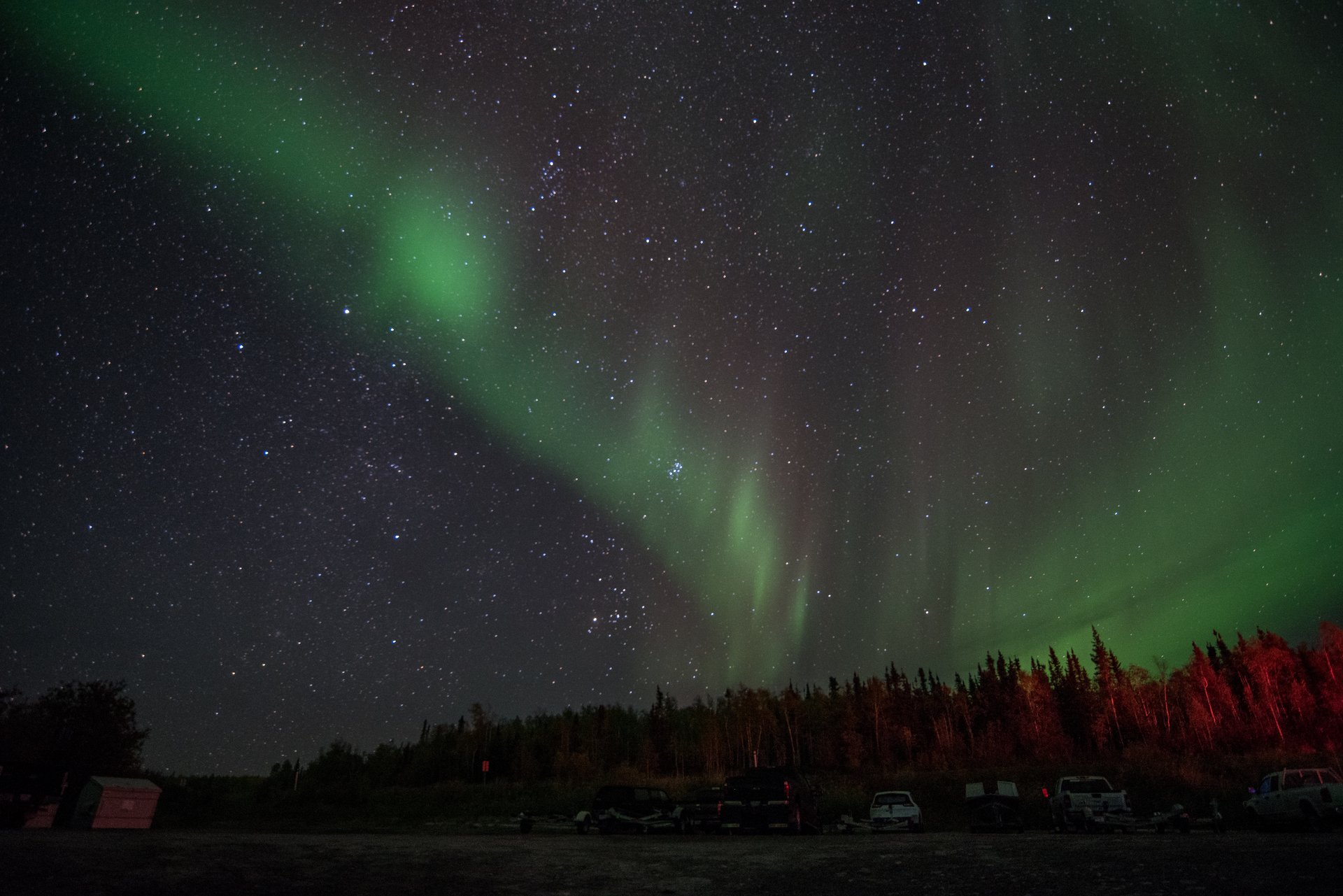 黃刀鎮Madeline湖邊熱鬧的極光,還有車輛幫忙打燈照亮前景。