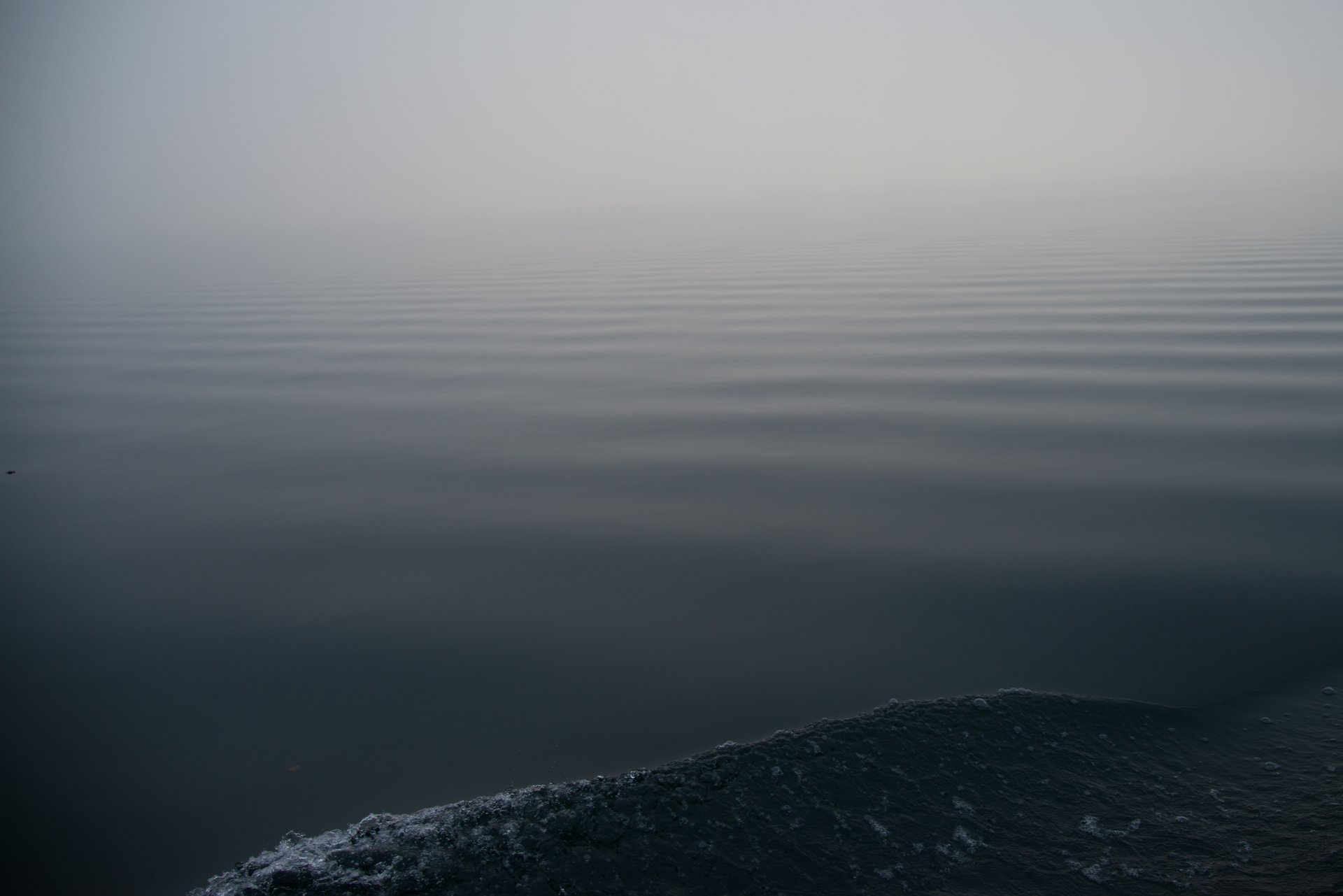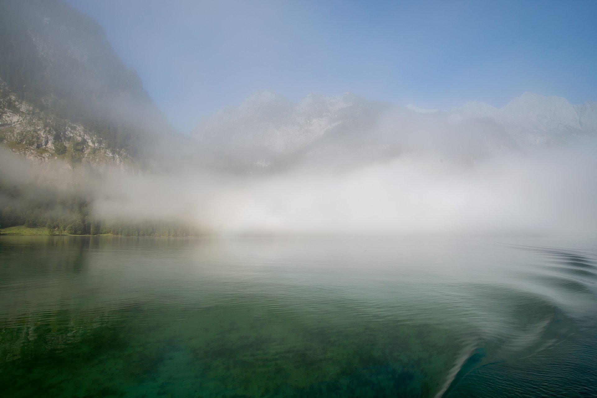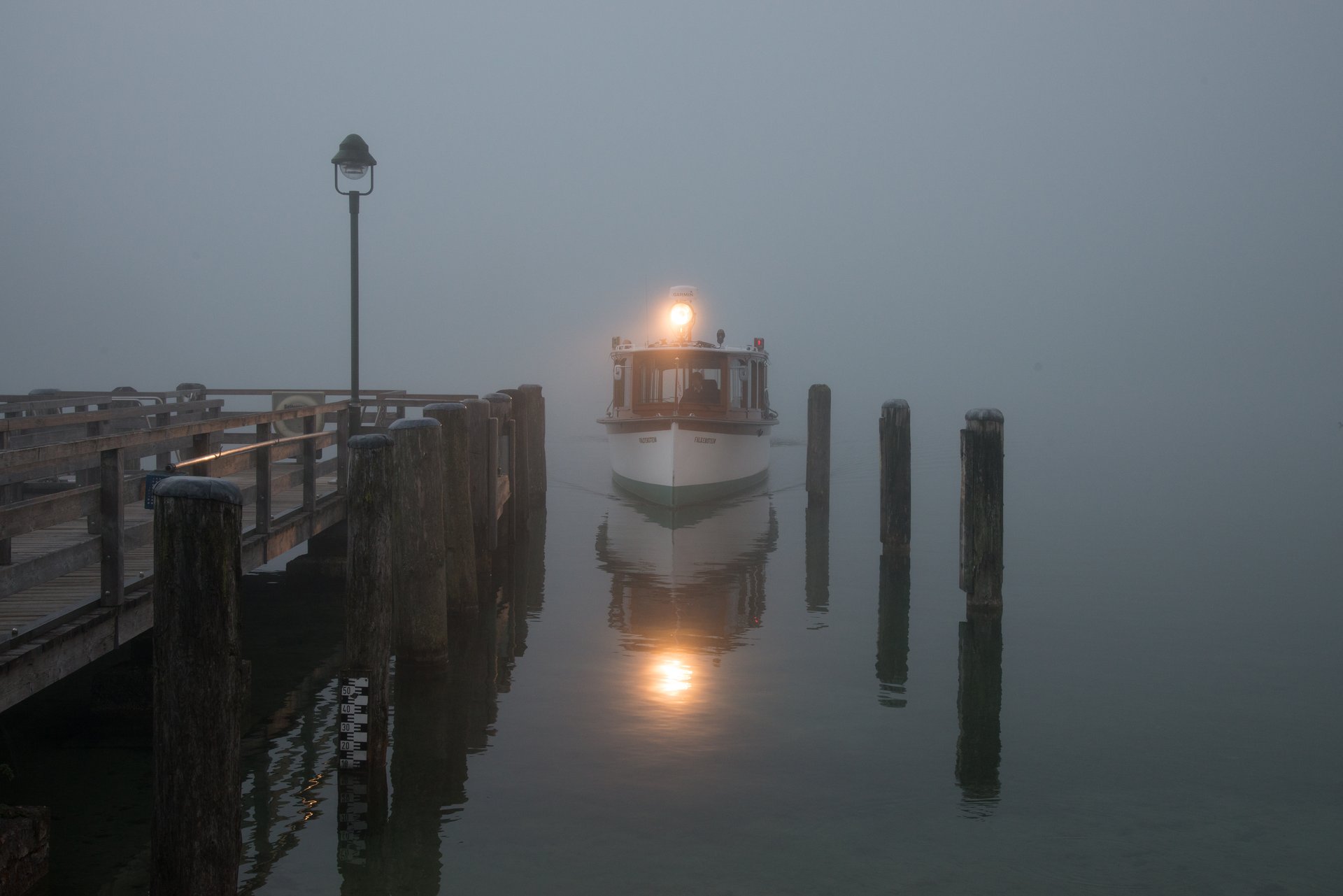 國王湖清晨迷霧中,第一班船緩緩駛來。