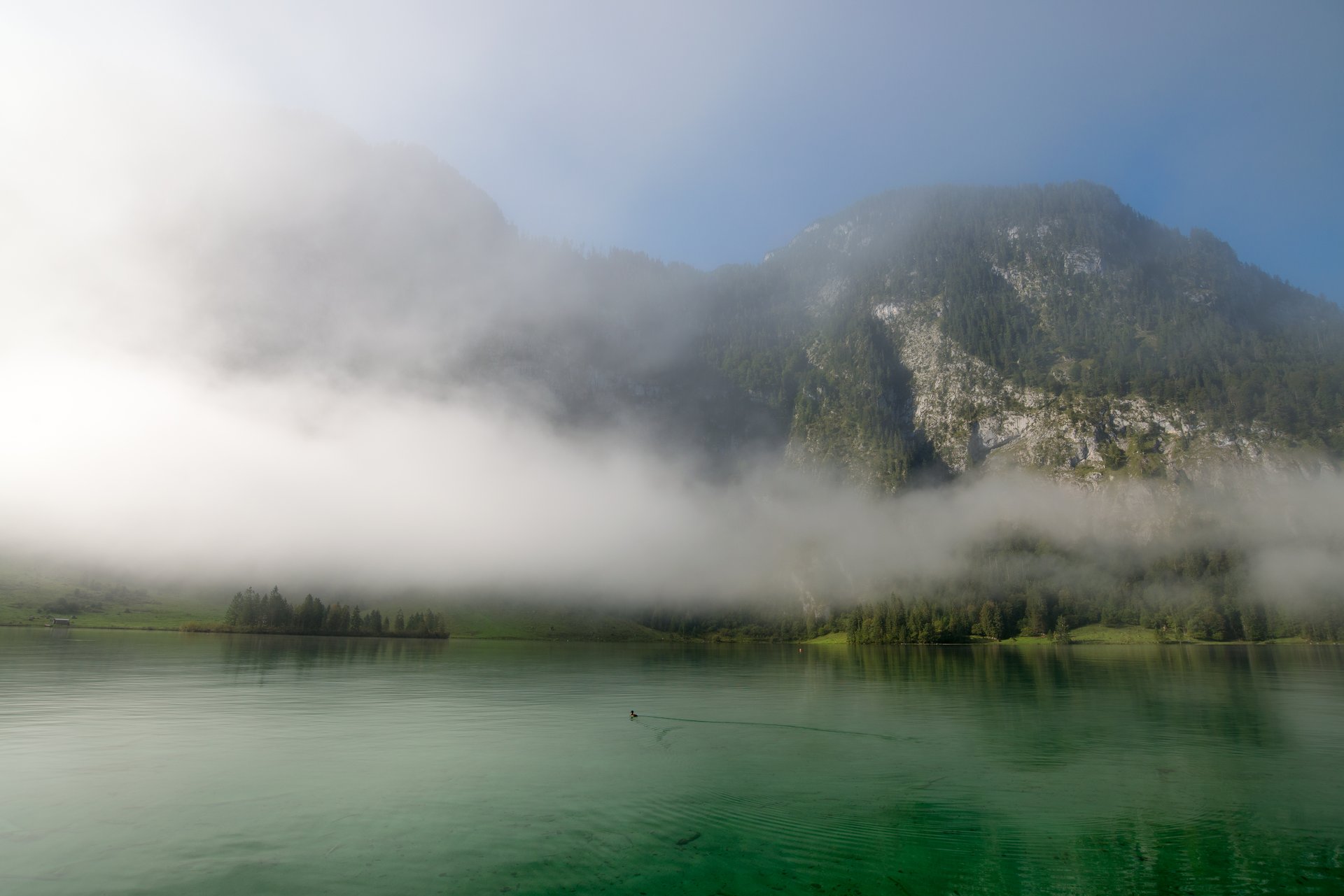 國王湖霧慢慢散了,乾淨的湖水綠的不像話。