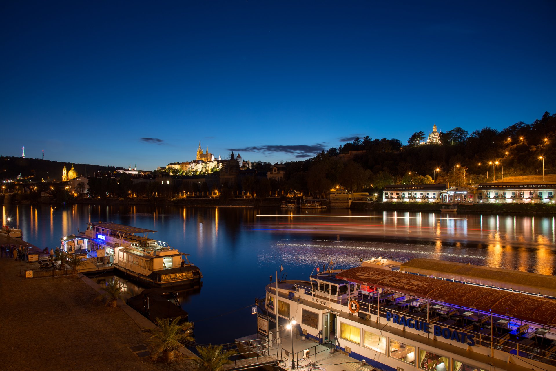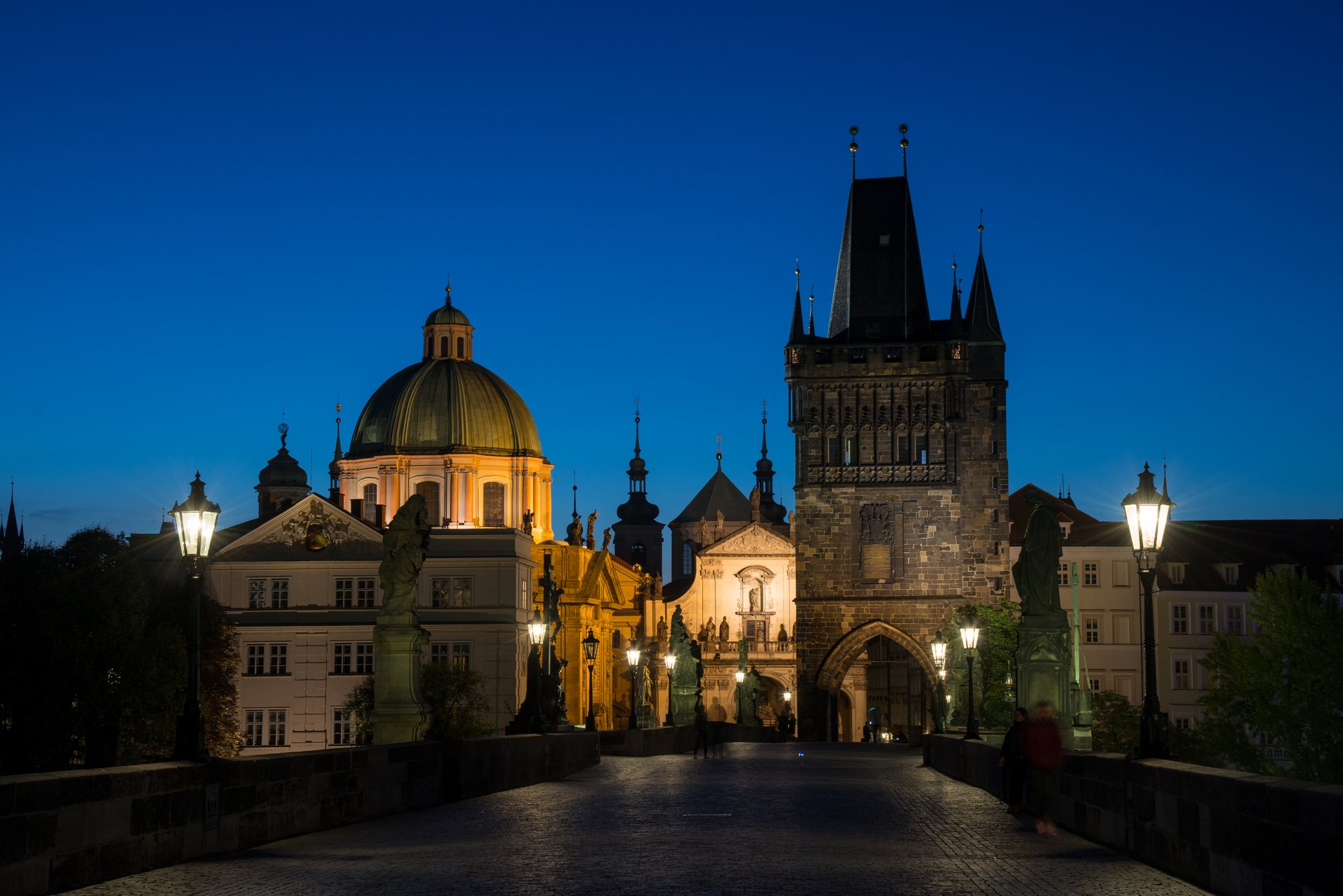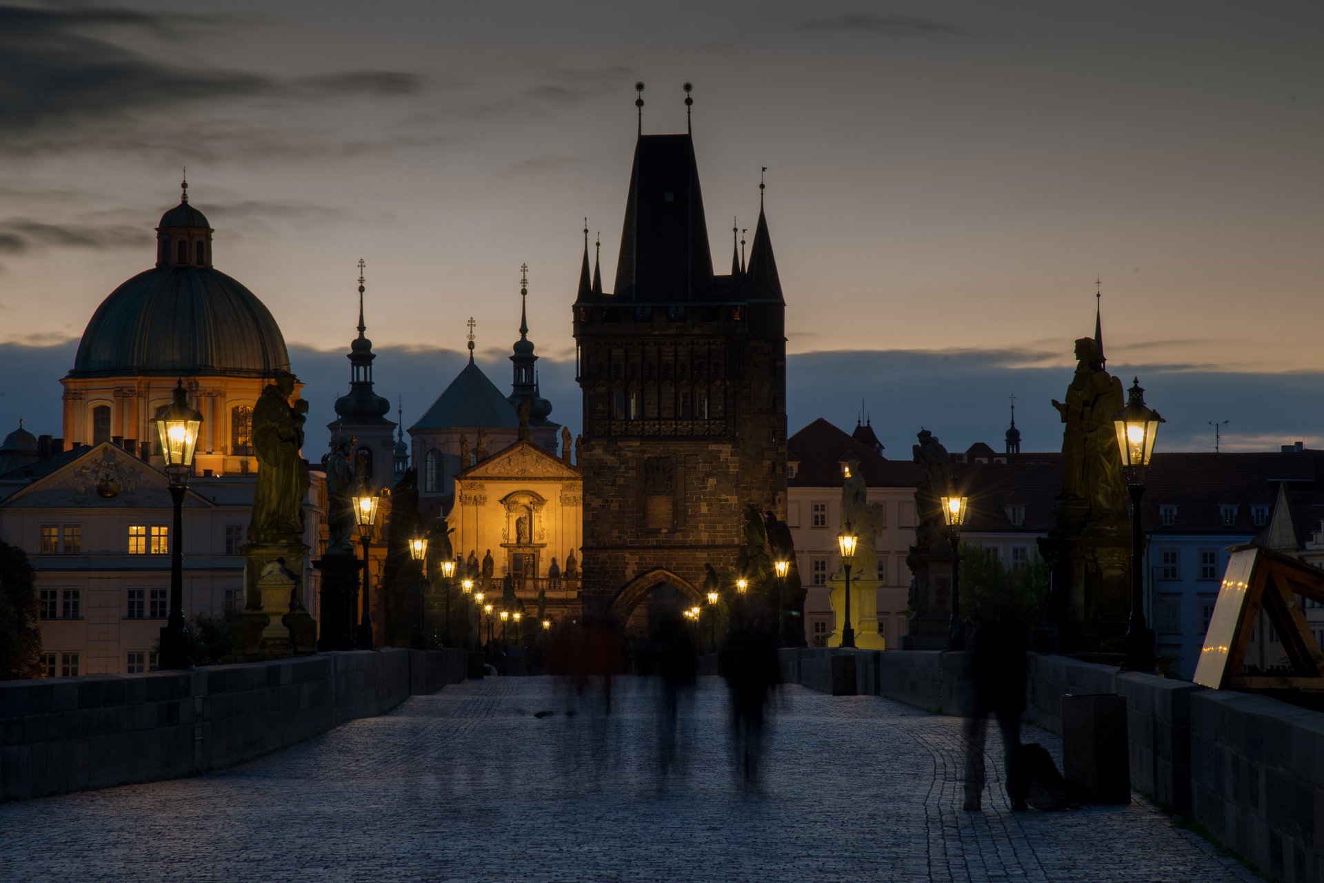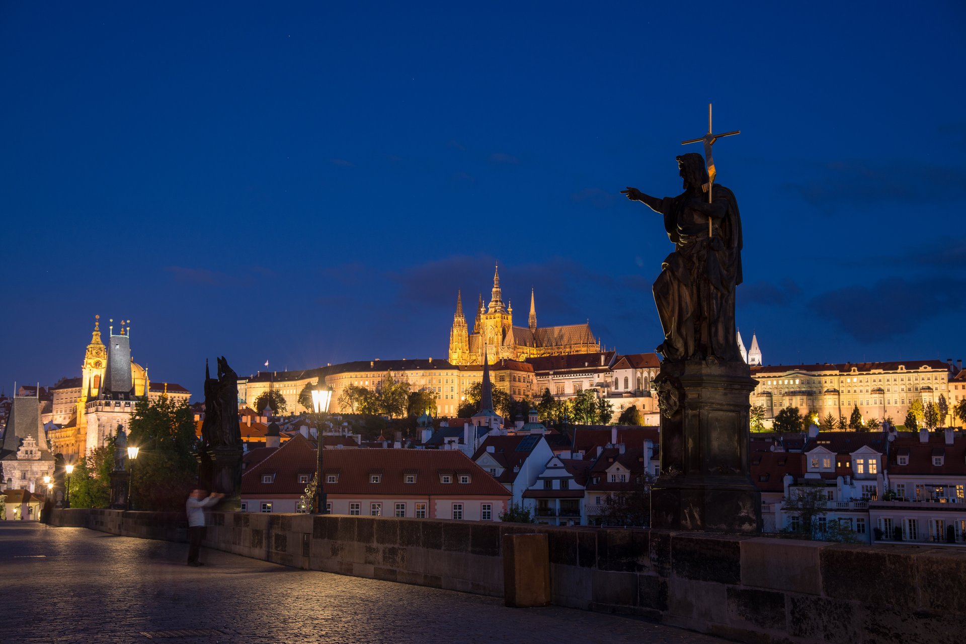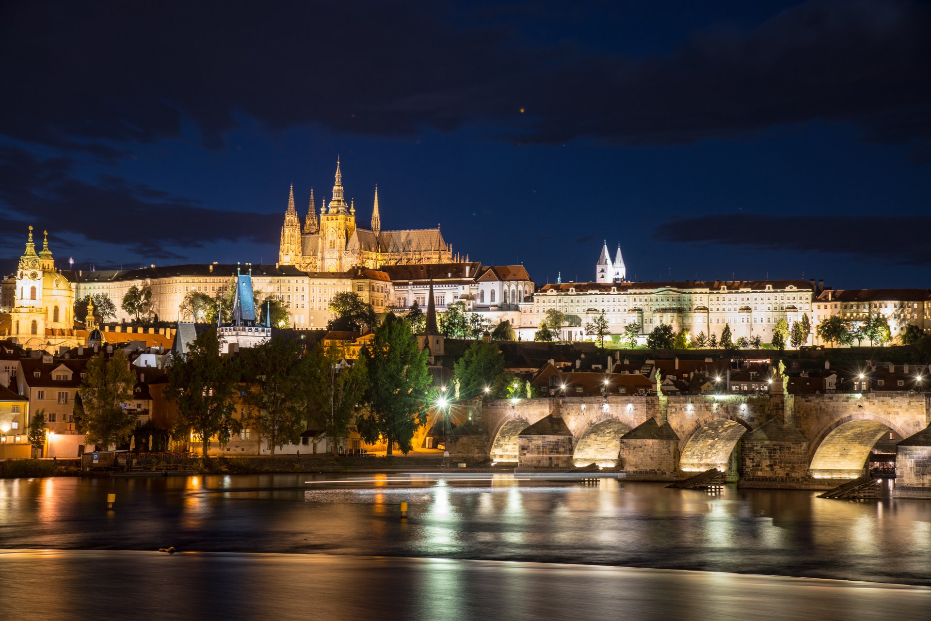 布拉格查理大橋夜景,背景是古堡皇宮區。
