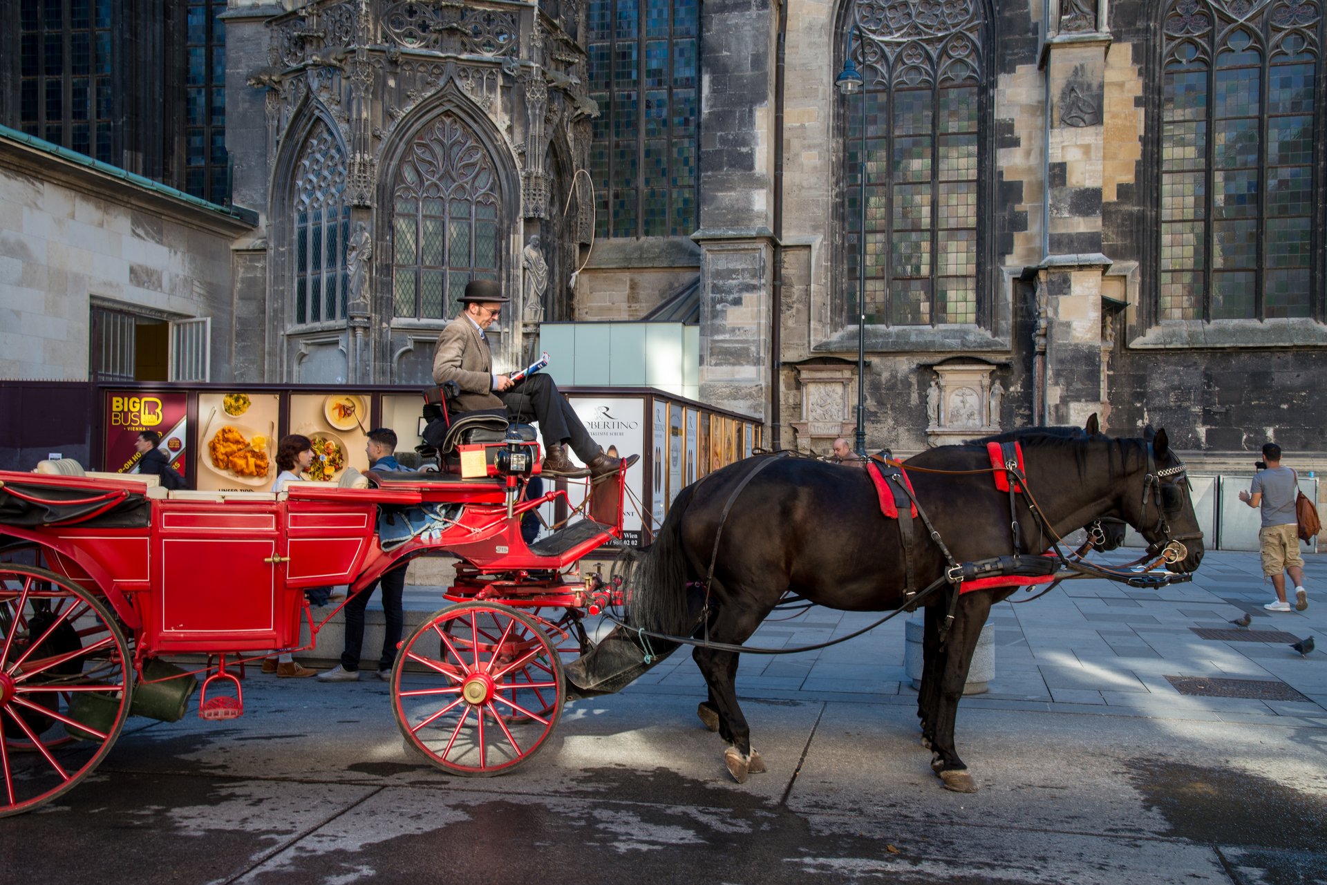 維也納史蒂芬大教堂後門排班的馬車夫,很優閒的看著書籍,等待遊客上門。